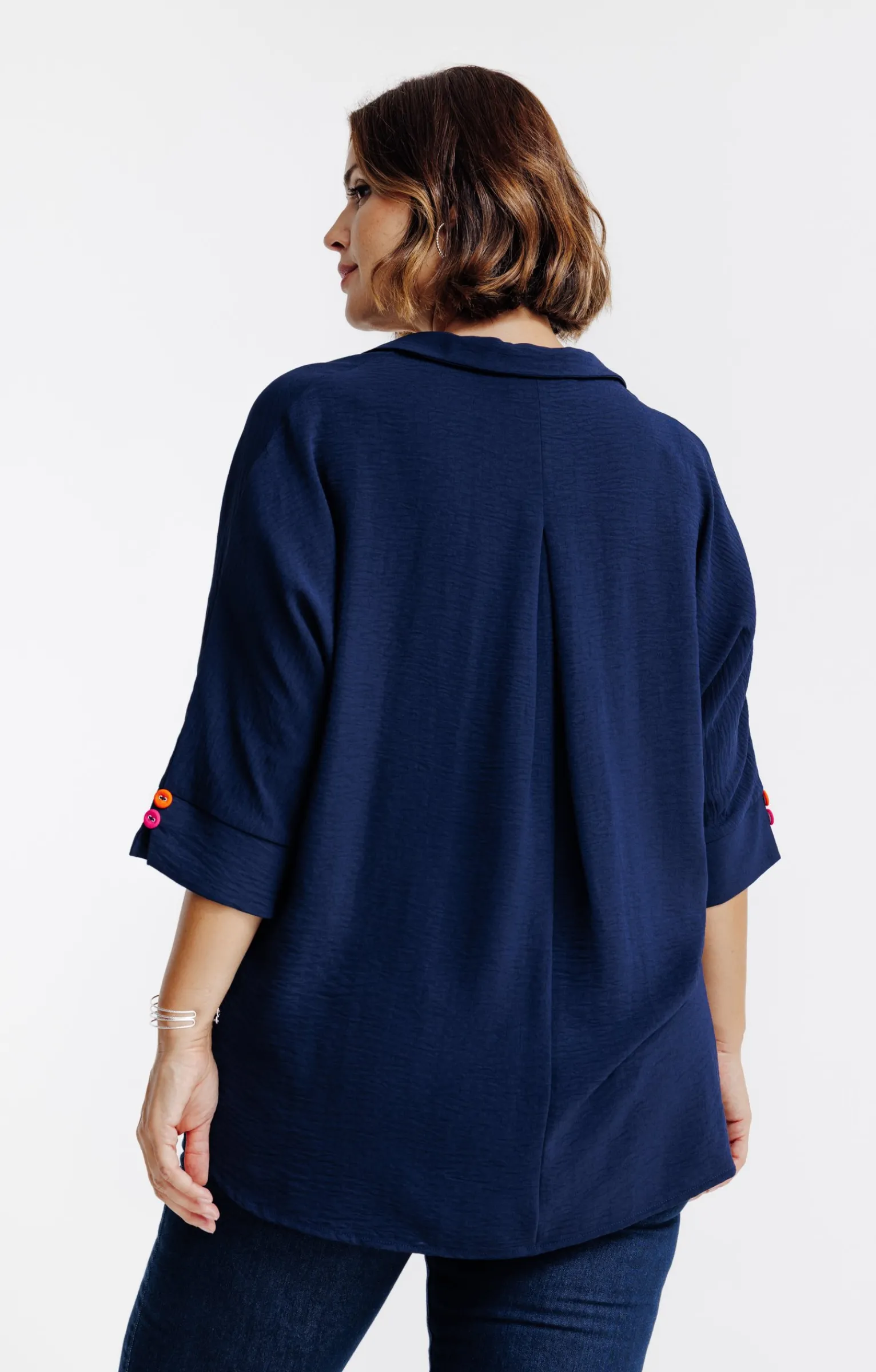Chemisier uni à manches coudes. Coupe ample. Col chemise avec patte partiellement boutonnée sur le devant. Deux boutons contrastants sur la patte de boutonnage et deux boutons décoratifs sur les manches. Fente d’aisance au dos. Base arrondie. Tissu à effet légèrement froissé.