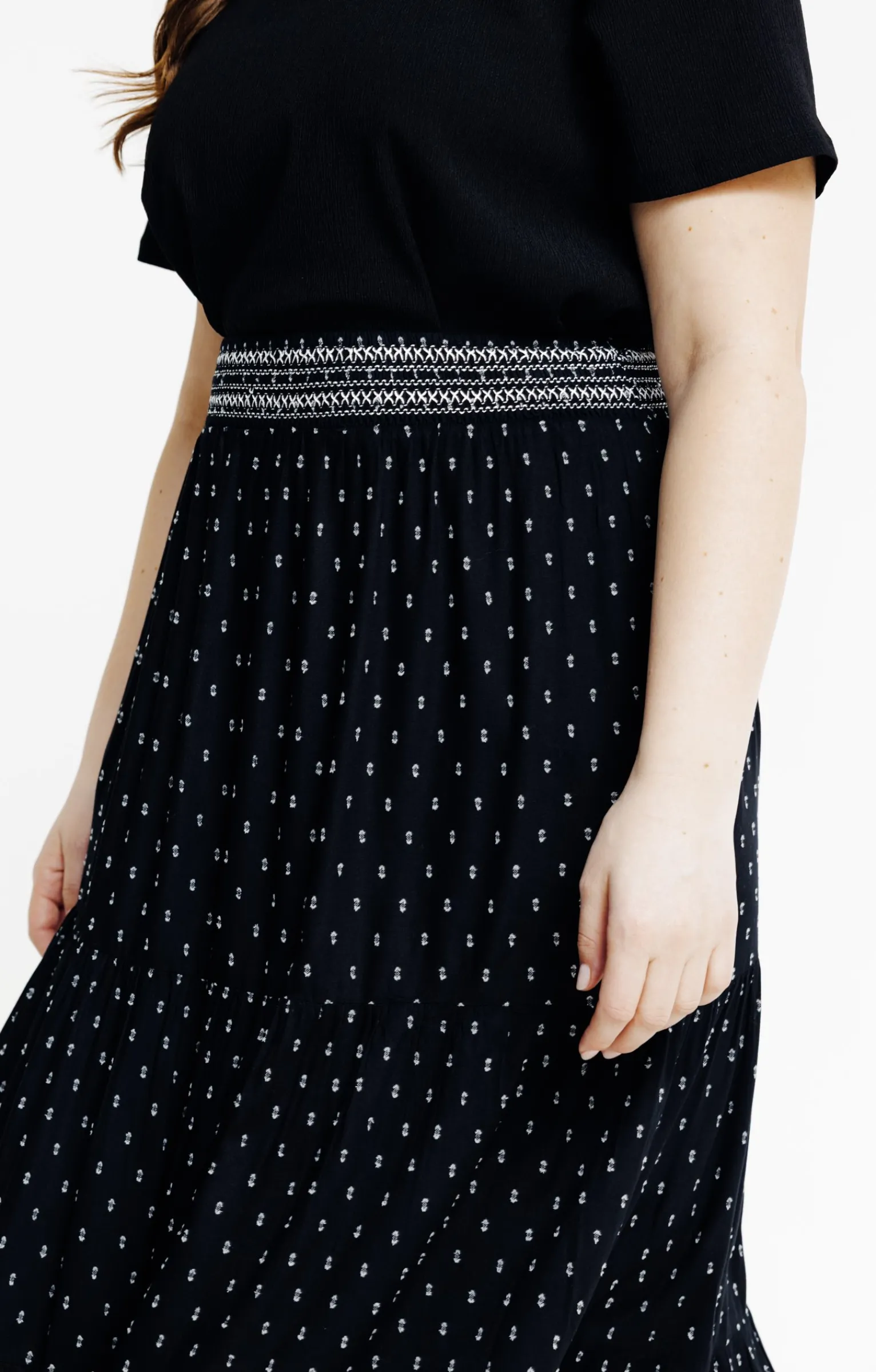 Jupe longue en plumetis. Coupe évasée. Longueur chevilles. Mini-motifs sur fond uni sur l’ensemble du modèle. Large taille élastiquée avec motifs géométriques contrastants brodés. Matière fine et légère au tombé fluide. Coutures discrètes en finition. Associez cette jupe à une blouse unie.