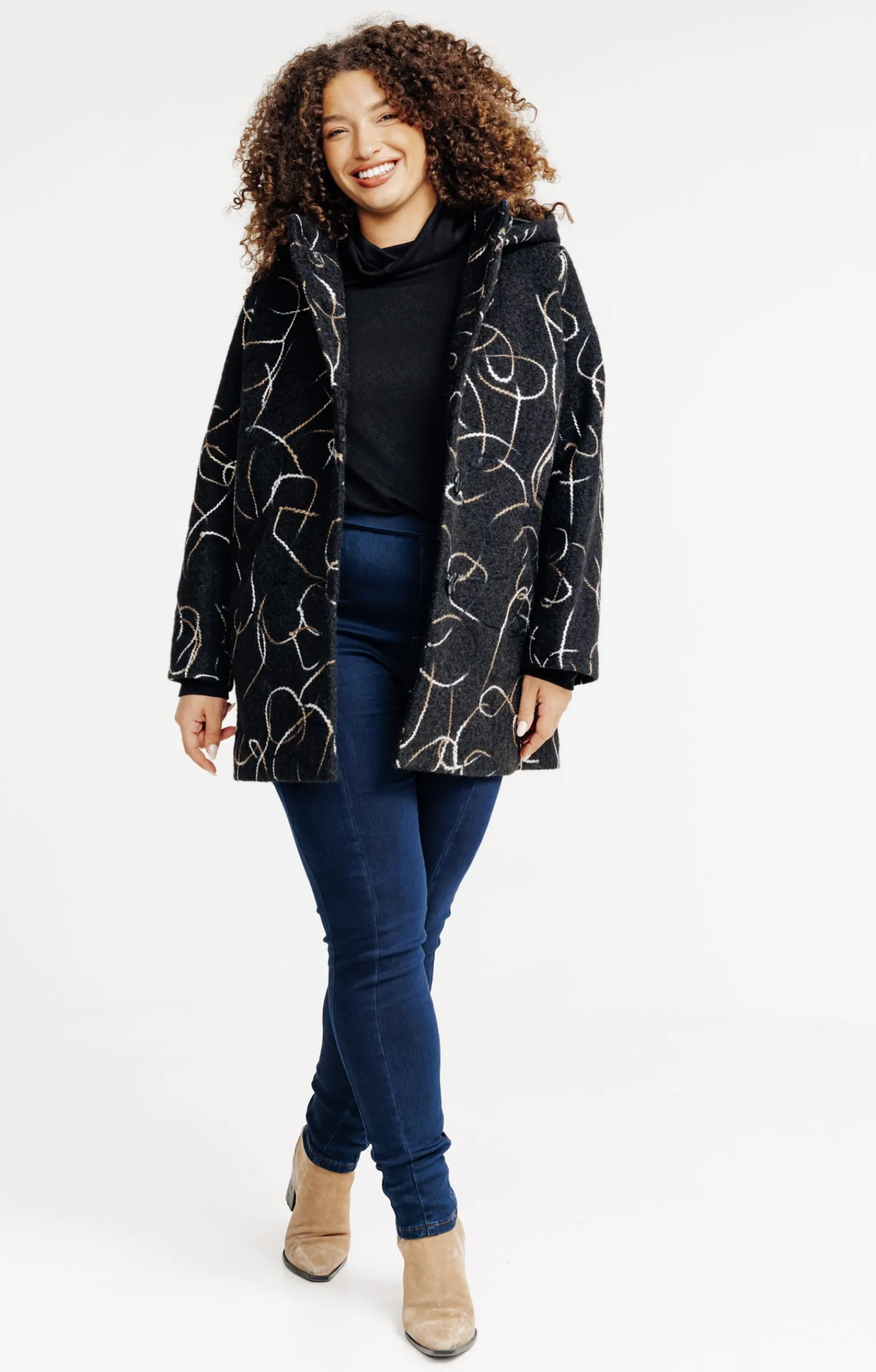 Misez sur l’originalité avec ce manteau imprimé. Manteau à capuche imprimé. Coupe droite. Manches longues à emmanchures droites. Col montant avec capuche. Fermeture boutonnée sur le devant. 2 poches en biais sur le devant. Imprimé fantaisie à motifs façon cordes. Modèle doublé.