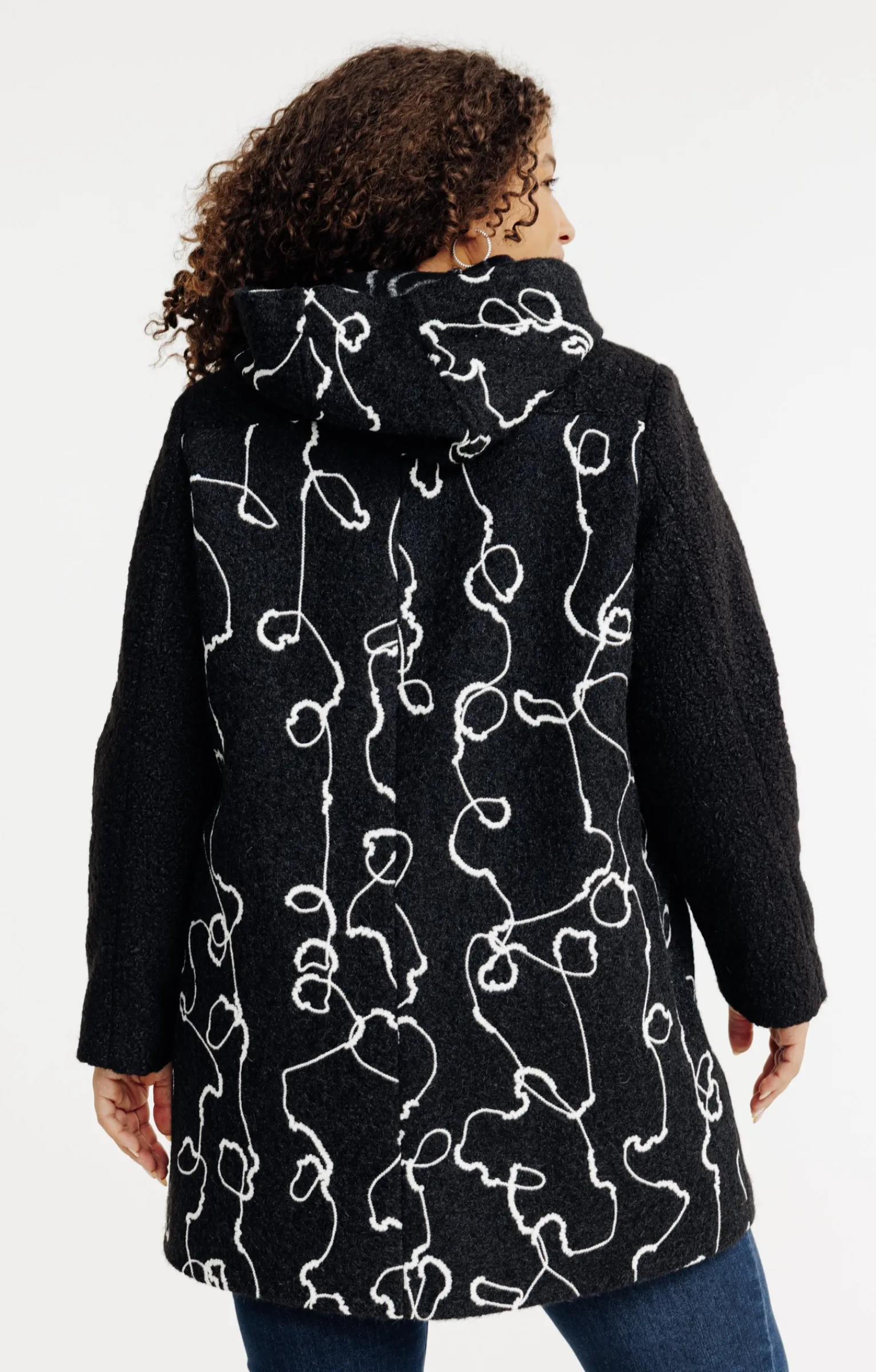 Manteau à capuche imprimé. Coupe droite. Longueur mi-cuisses. Manches longues à emmanchures droites. Col capuche. Fermeture zippée sur le devant. 2 poches plaquées unies sur le devant. Motifs fleurs stylisées devant, au dos et sur la capuche, dans un coloris contrastant. Manches unies. En maille bouclette. Modèle doublé.