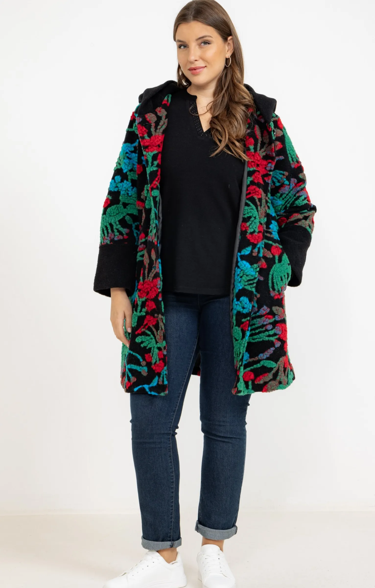 Manteau à capuche imprimé floral multicolore. Coupe légèrement cintrée. Longueur mi-longue. Manches longues. Col avec capuche unie. Fermeture boutonnée sur le devant. 2 poches raglan sur le devant. Imprimé à grands motifs floraux multicolores en relief. Bout des manches uni. Matière douce et chaude. Composition en laine majoritaire.