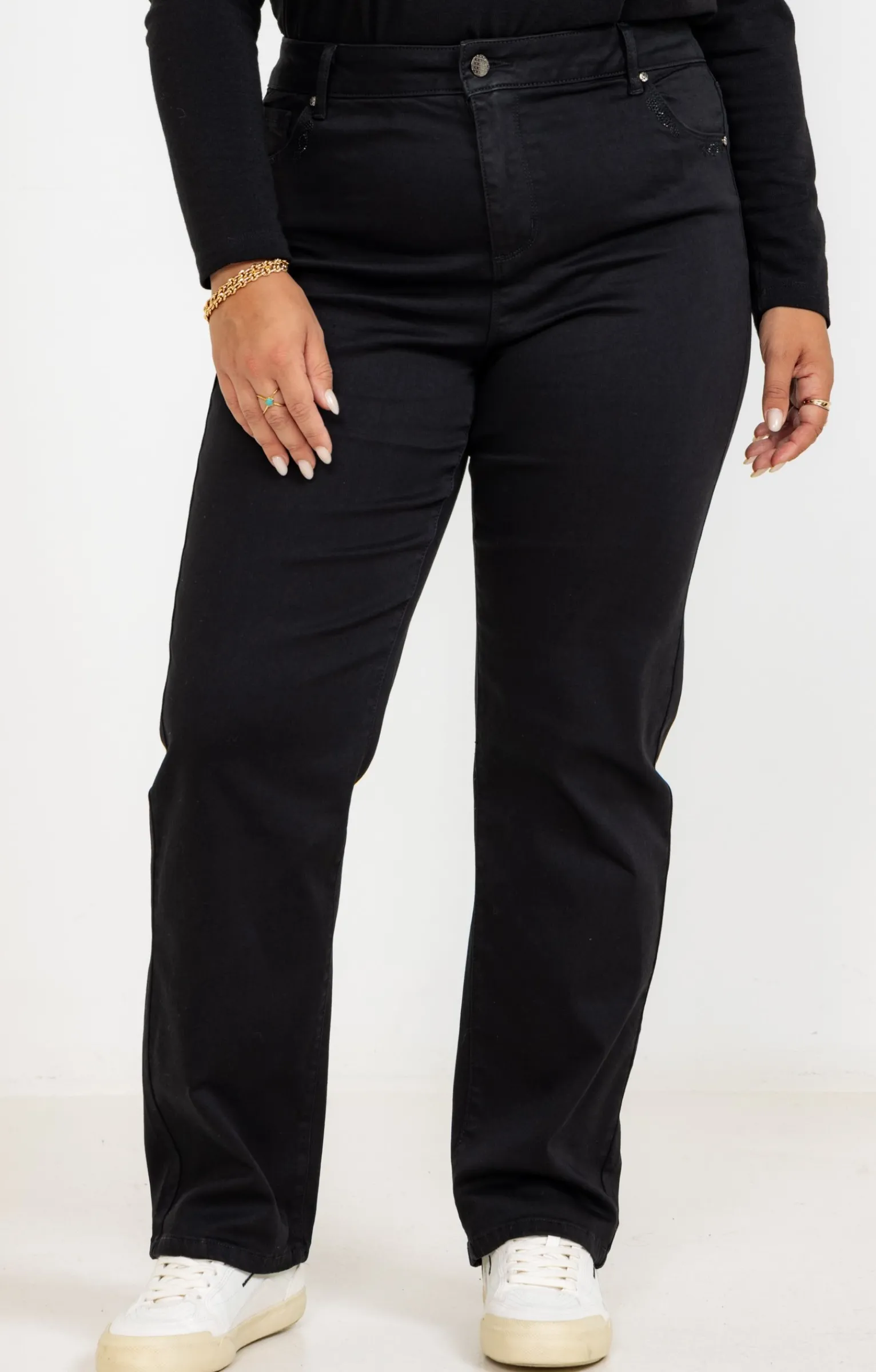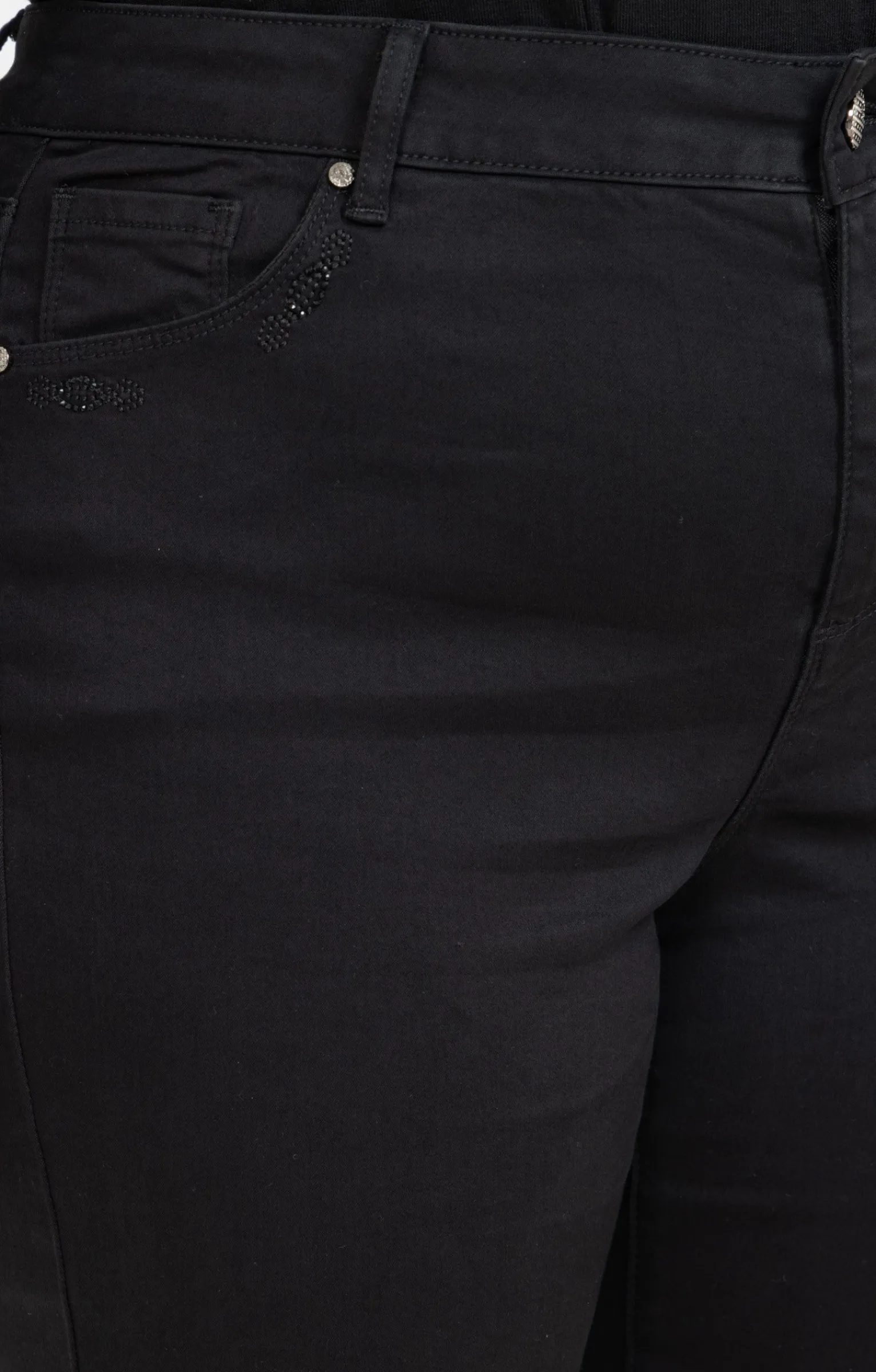 Pantalon droit avec détails strass. Coupe droite. Fermeture zippée et boutonnée sur le devant. 2 poches cavalières et une poche ticket sur le devant. 2 poches plaquées au dos. Coloris uni. Matière extensible. Motifs esprit poissons en strass sur le bord des poches devant et dos. Passants pour ceinture. Étiquette sur la ceinture au dos. Coutures ton sur ton.