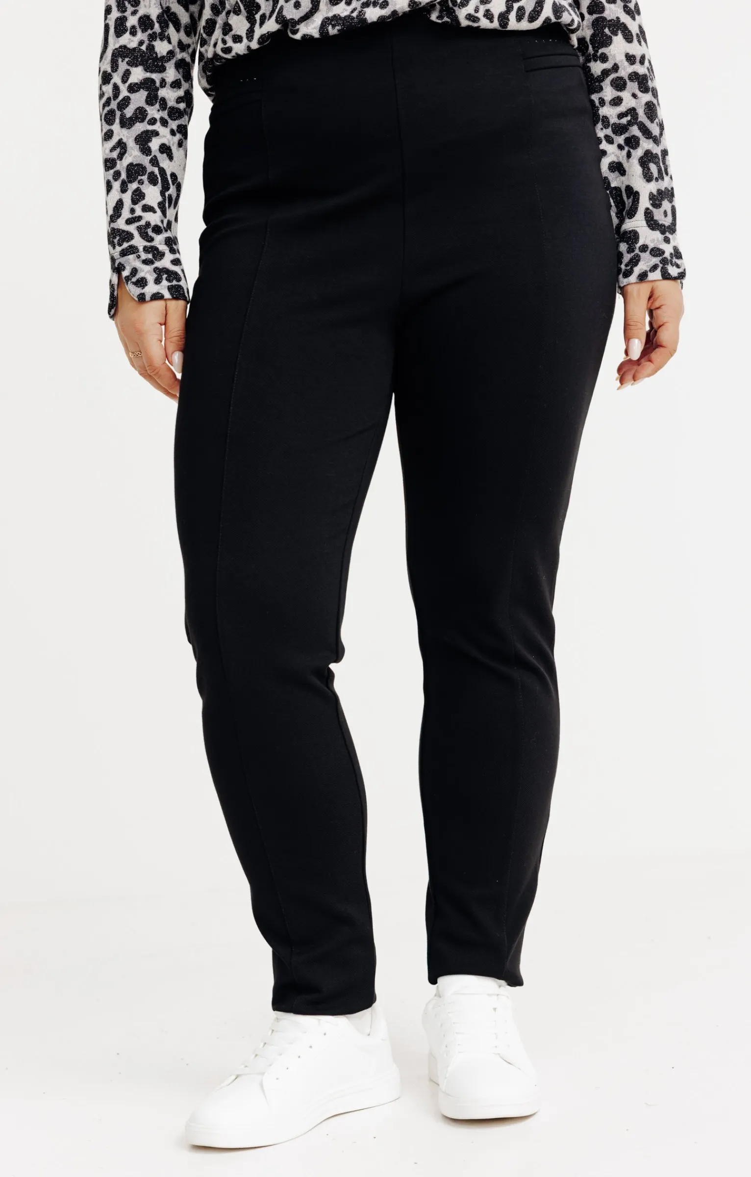 Alliez confort et élégance avec ce pantalon uni. Pantalon à taille élastiquée avec mini strass. Coupe légèrement ajustée. Longueur longue. Taille élastiquée. Coloris uni. Matière extensible. Découpes esprit fausses poches passepoilées sous la taille de chaque côté. Mini strass au niveau des découpes. Coutures discrètes en finition du modèle.