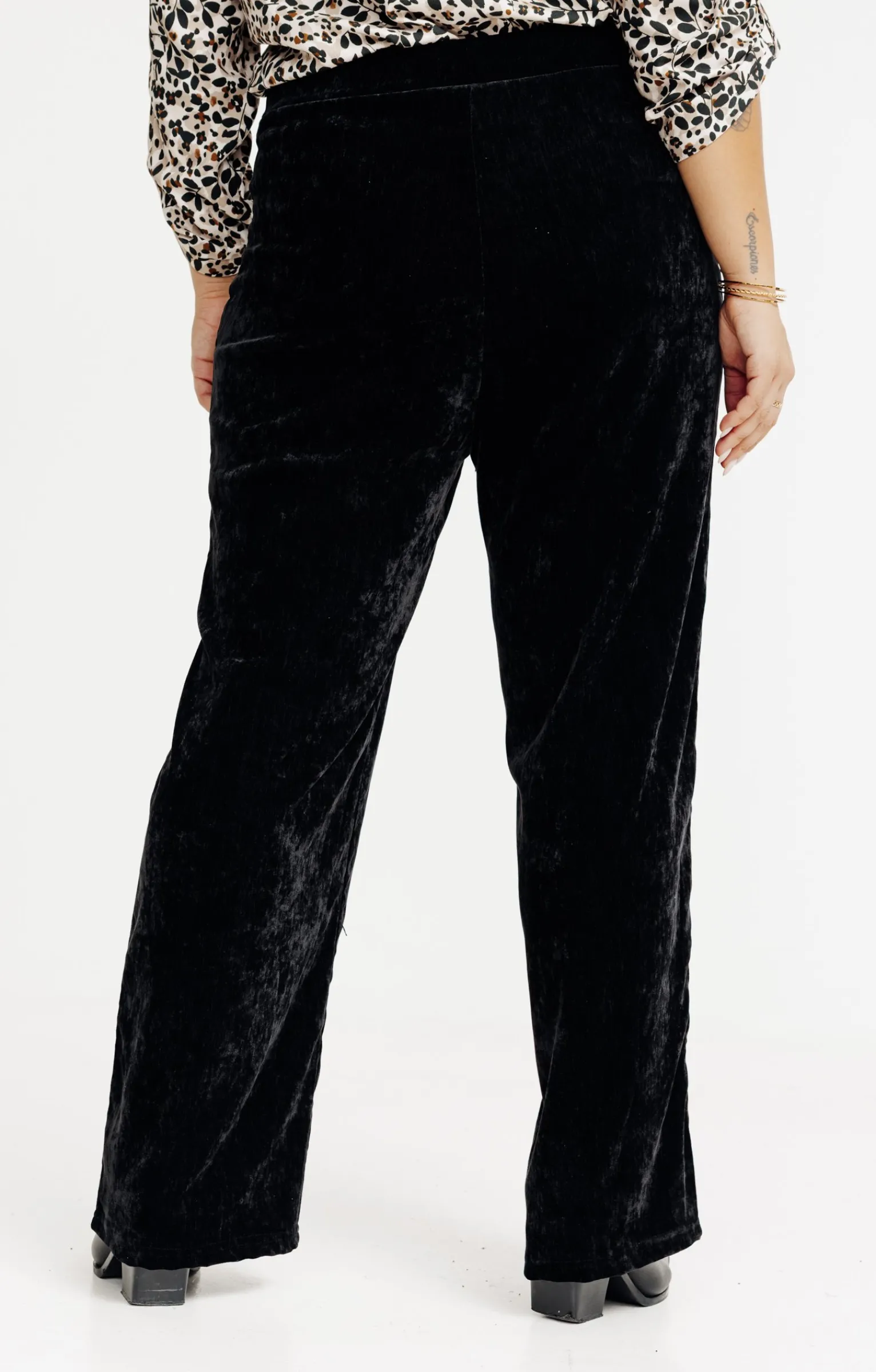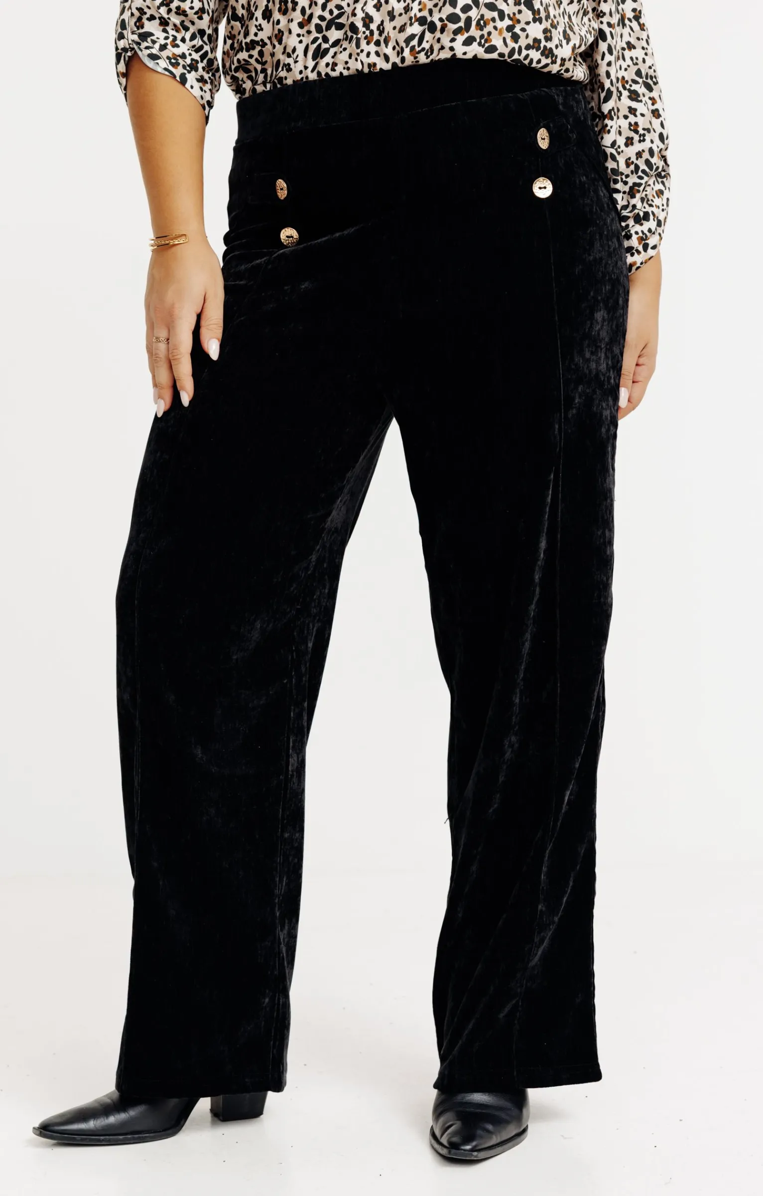 Pantalon à taille élastiquée avec boutons décoratifs. Coupe droite avec jambes larges. Longueur longue. Taille plate élastiquée. Coloris uni. Matière extensible façon velours. 2 rangées de 2 boutons métalliques avec motifs en relief cousus sous la taille. Coutures discrètes en finition du modèle.