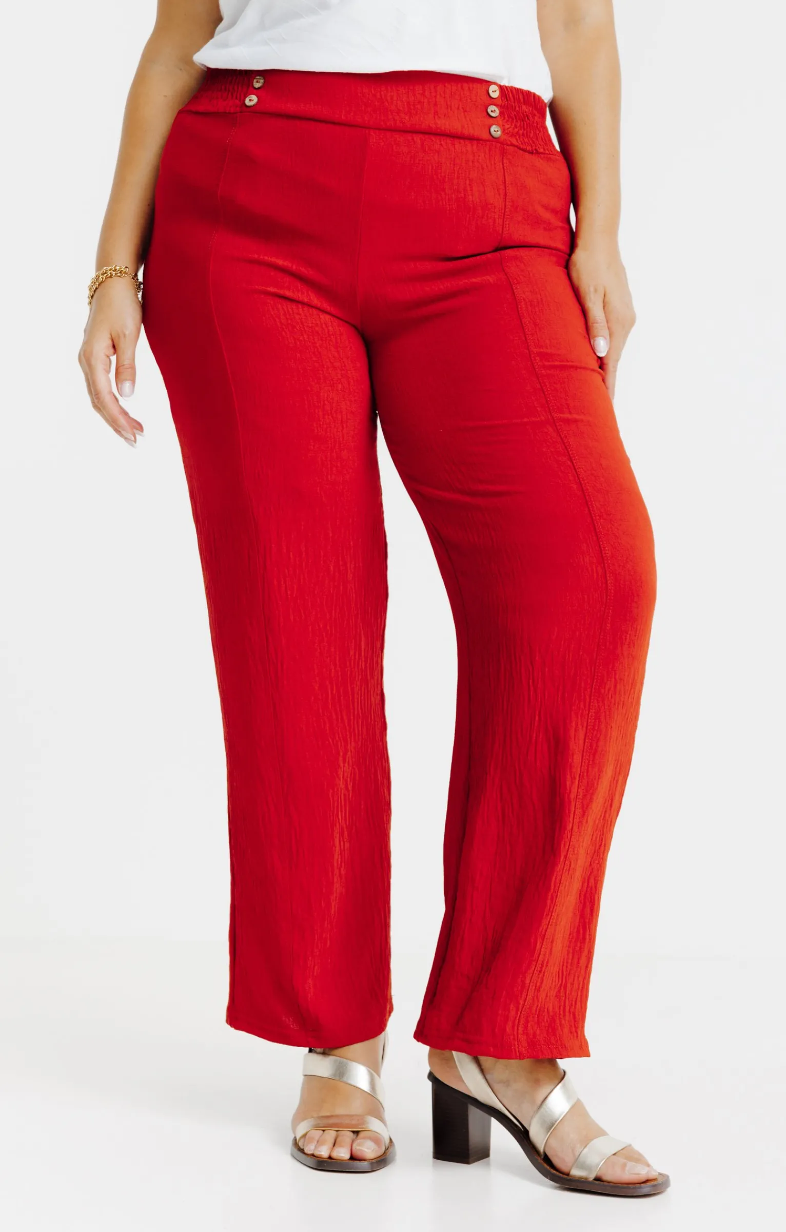 Pantalon large en crêpe uni avec taille élastiquée et boutons décoratifs. Coupe ample. Teinte unie. Matière crêpe légère. Taille smockée au dos et aux hanches. Petits boutons coco ornementaux aux extrémités de la ceinture plate devant. Couture centrée en relief depuis la taille au bas des jambes devant.