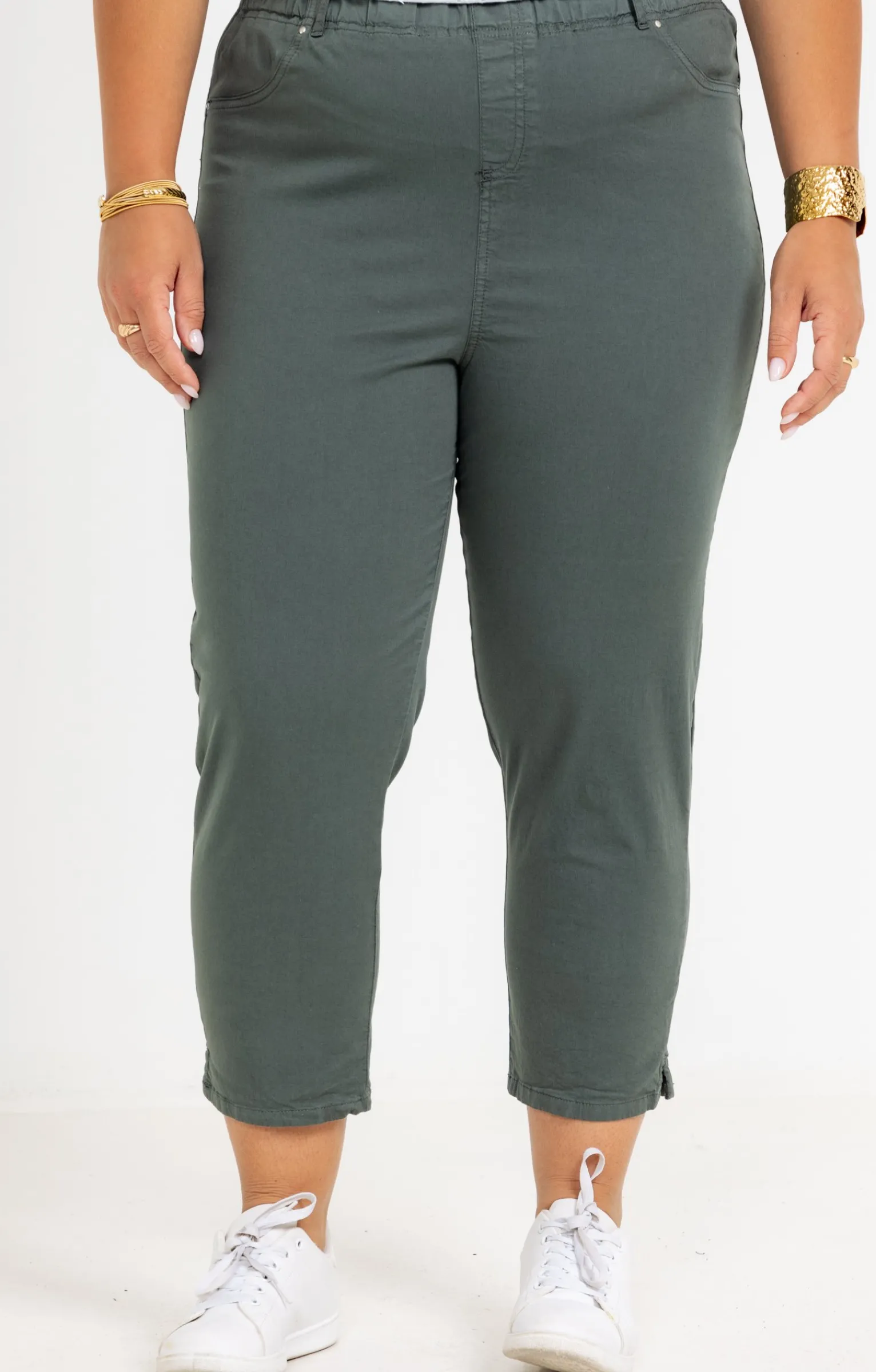 Tregging 7/8 uni avec détails rivets. Coupe slim. Longueur 7/8. Faux zip avec ceinture élastiquée à fines fronces. 2 fausses poches cavalières devant. 2 poches plaquées au dos. Coloris uni. Tissu façon toile léger et souple. Matière extensible. Rivets sur les poches devant. Surpiqûres ton sur ton. Petite fente sur le bas des jambes. Passants pour ceinture.