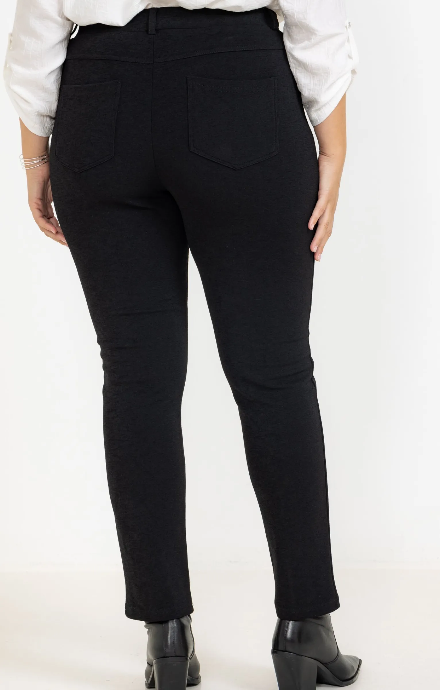 Tregging uni avec poches zippées. Coupe slim. Longueur longue. Fausse fermeture zippée sous bord avec large ceinture élastiquée. 2 fausses poches zippées devant. 2 poches plaquées au dos. Coloris uni. Tissu en maille extensible. Plis surpiqués le long de la jambe devant. Passants pour ceinture. Surpiqûres ton sur ton en finition du modèle. Zips métallisés.