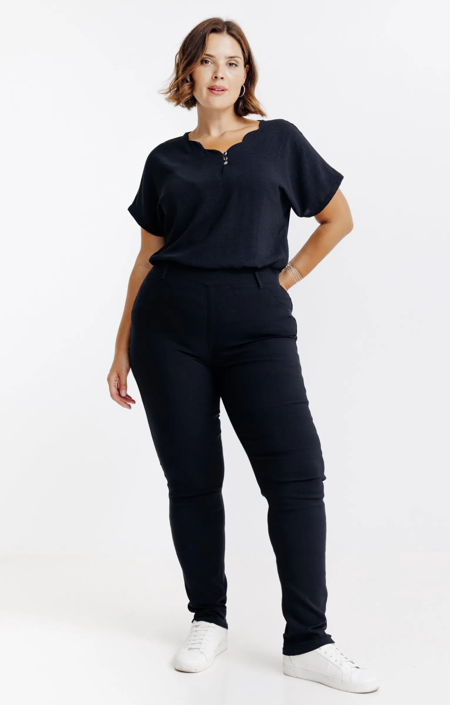 Pantalon ajusté uni avec détails strass. Coupe ajustée. Longueur longue. Fausse fermeture zippée avec taille élastiquée. 2 fausses poches italiennes devant. 2 poches plaquées au dos. Coloris uni. Tissu façon denim. Matière extensible. Strass sur les poches devant. Passants pour ceinture. Surpiqûres ton sur ton en finition du modèle.