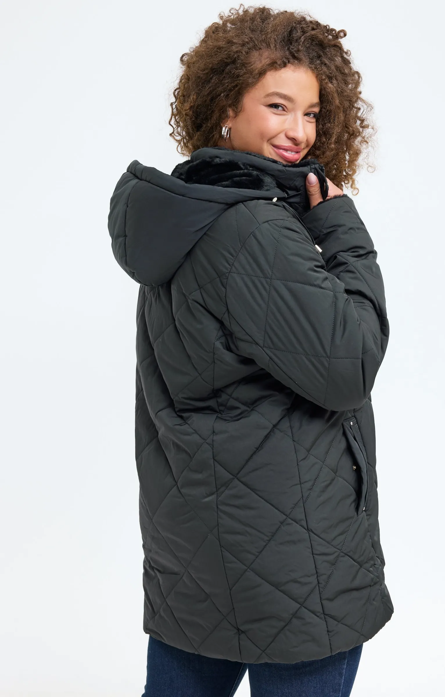 Parka mi-longue à capuche. Coupe droite. Longueur mi-cuisses. Manches longues à emmanchures droites. Col montant avec capuche amovible par un zip. Fermeture zippée dissimulée sous une patte pressionnée. 2 poches raglan devant. Coloris uni. Matelassage à grands motifs losanges. Cordon de serrage à la capuche. Poignets et intérieur du col fourrés. Modèle doublé.