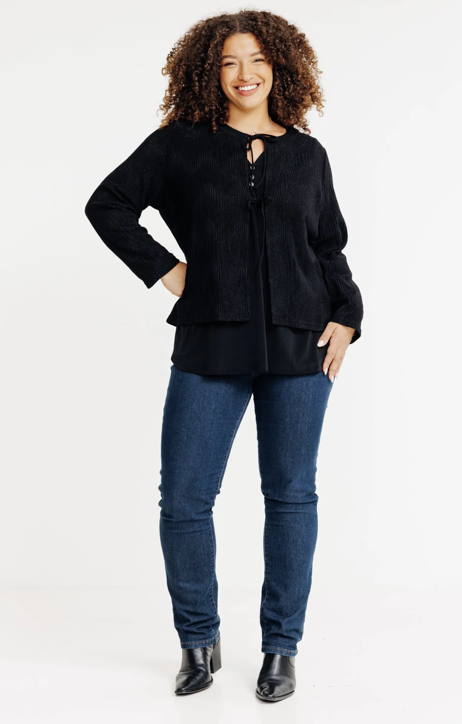 Facile à associer, ce cardigan fait partie des indispensables du vestiaire féminin. Cardigan uni à nouer. Coupe droite courte. Manches longues à emmanchures droites. Col rond fendu. Fermeture par des liens à nouer au niveau du col. Coloris uni. Matière extensible.