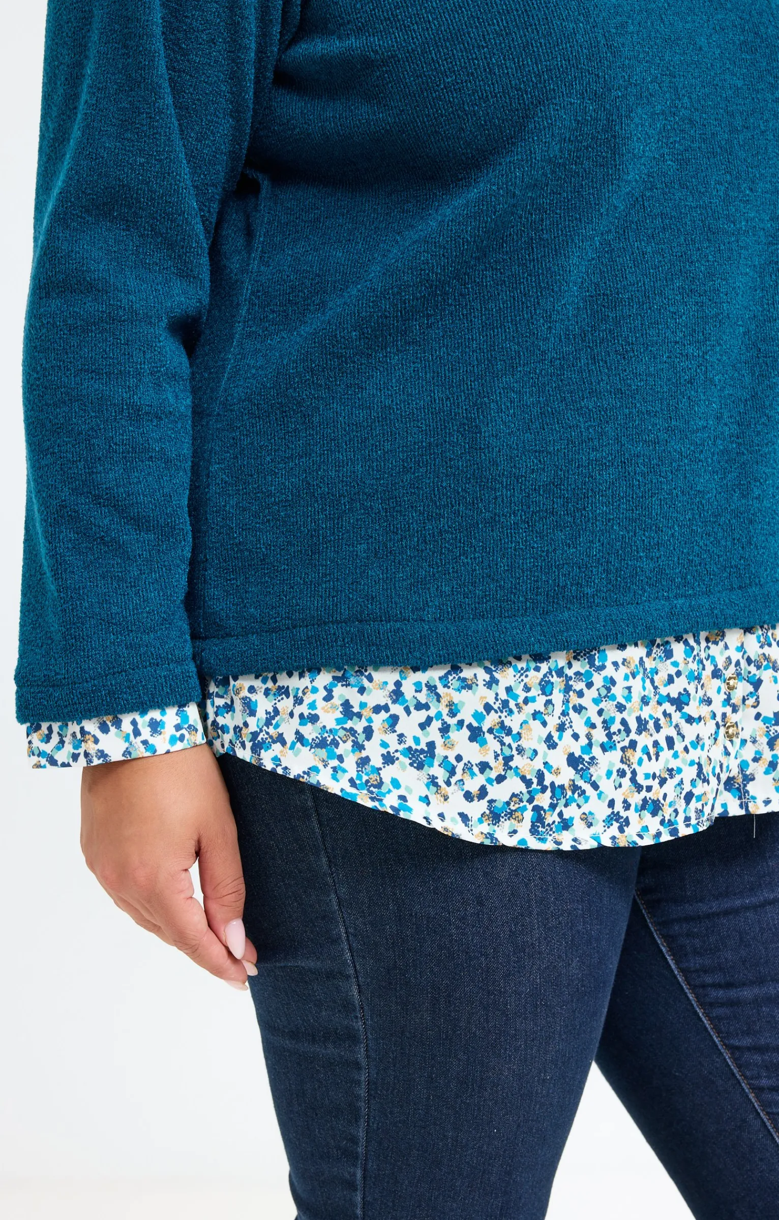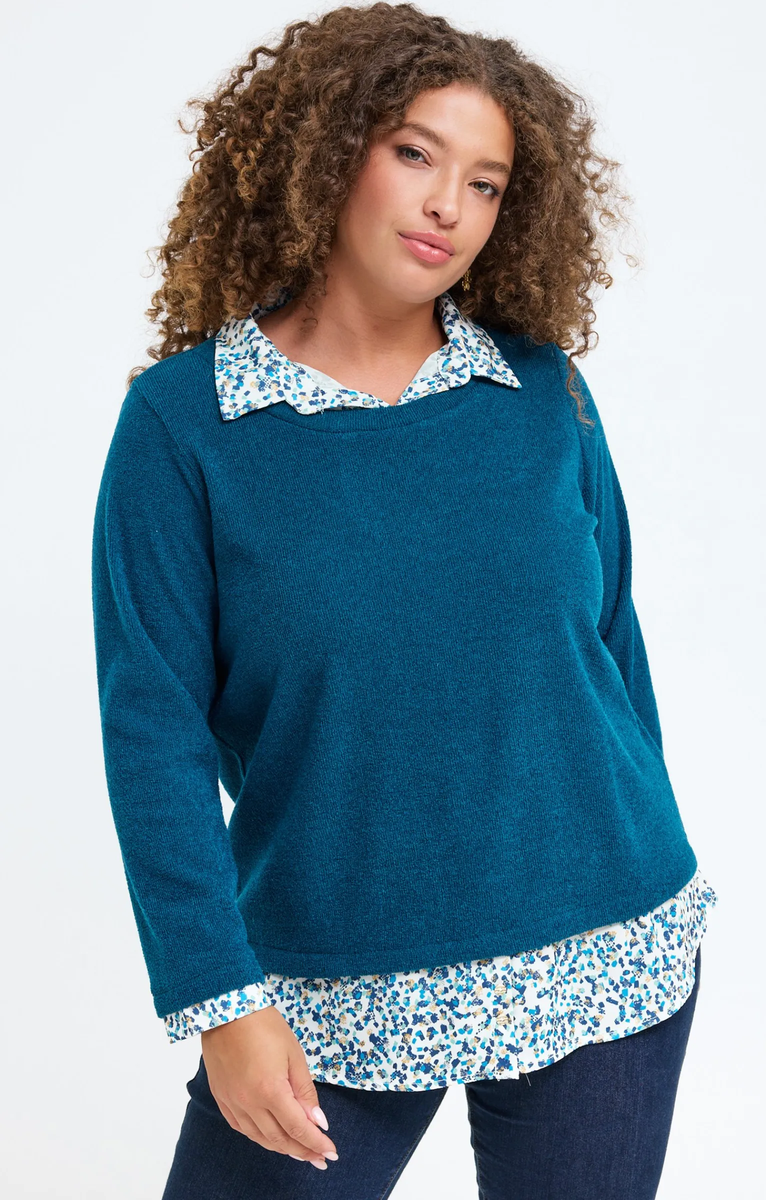 Pull 2 en 1 à motifs multicolores. Coupe droite. Manches longues. Emmanchures droites. Col classique et col rond. Pull en coloris chiné. Effet chemisier à petits motifs graphiques multicolores en camaïeu de tons. Tricot en maille jersey extensible et matière fluide. Côtés légèrement incurvés. Finition arrondie devant et au dos.