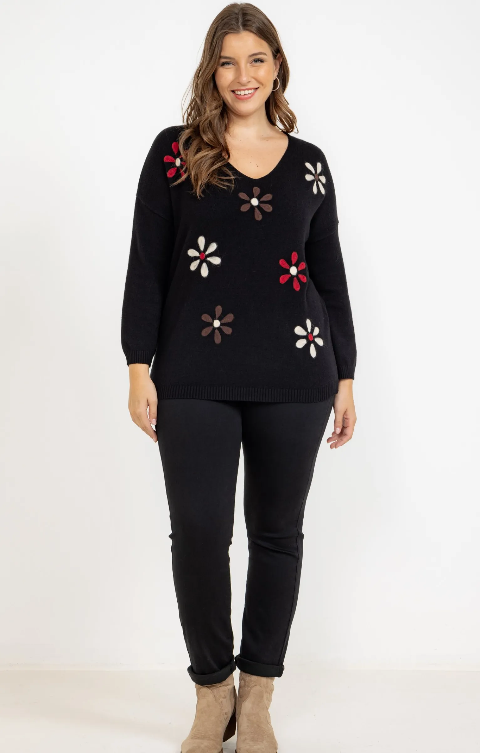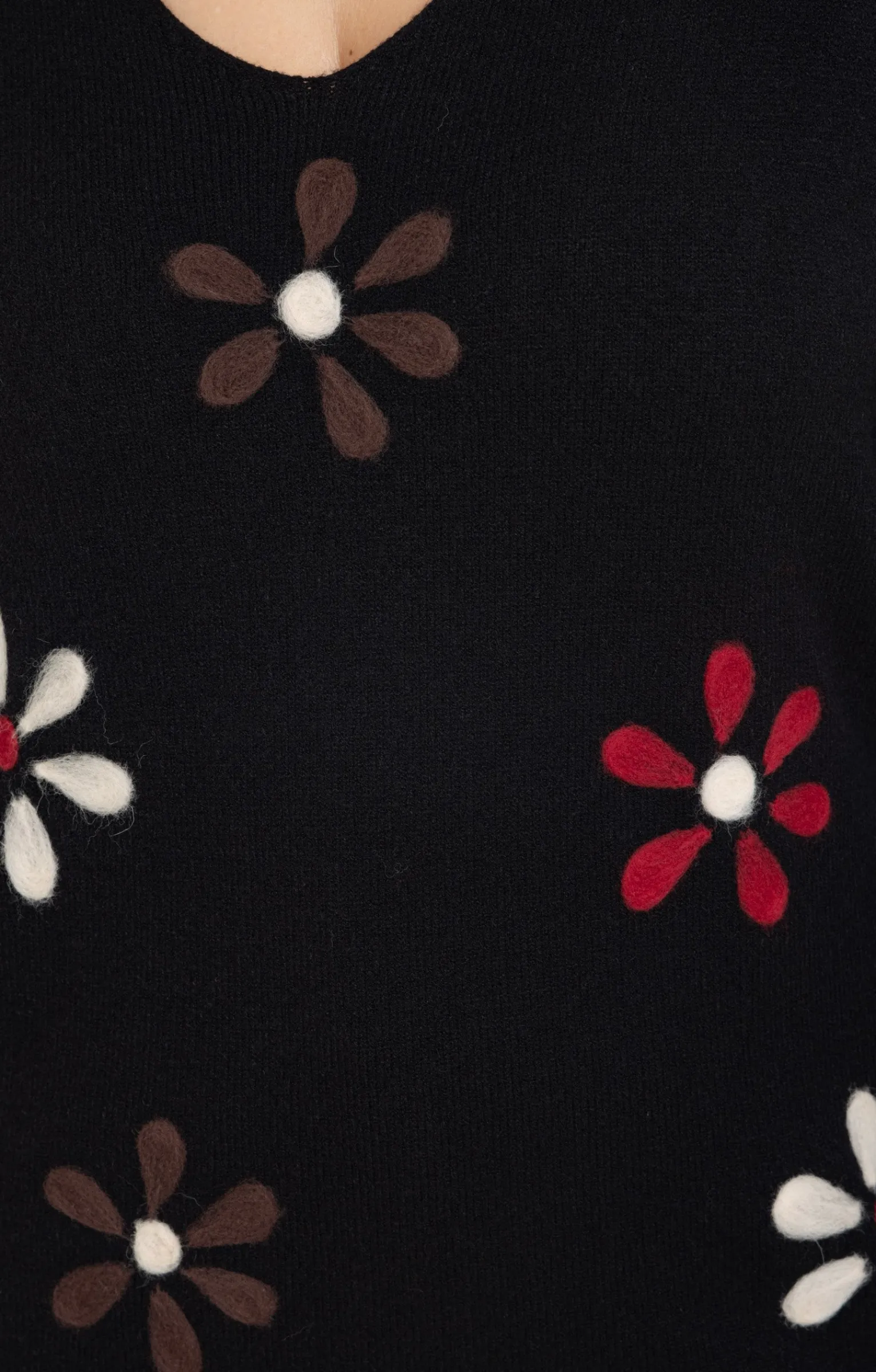 Ajoutez une touche fraîche à vos tenues quotidiennes avec ce pull à manches longues avec fleurs duveteuses. Coupe droite. Manches longues. Emmanchures tombantes. Décolleté V. Teinte unie manches et dos. Fleurs multicolores duveteuses devant. Tricot en maille jersey. Col, poignets et base en côtes.