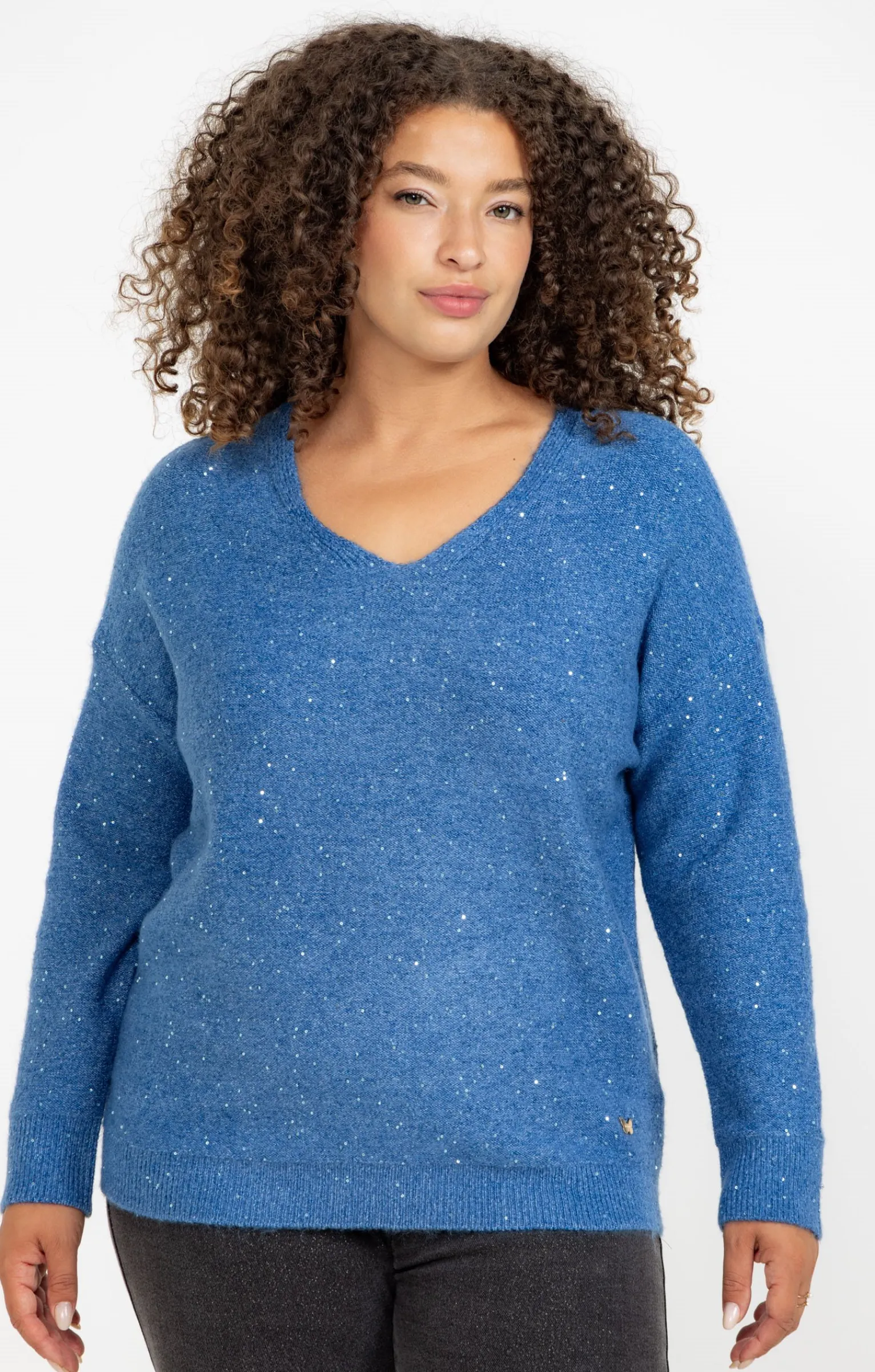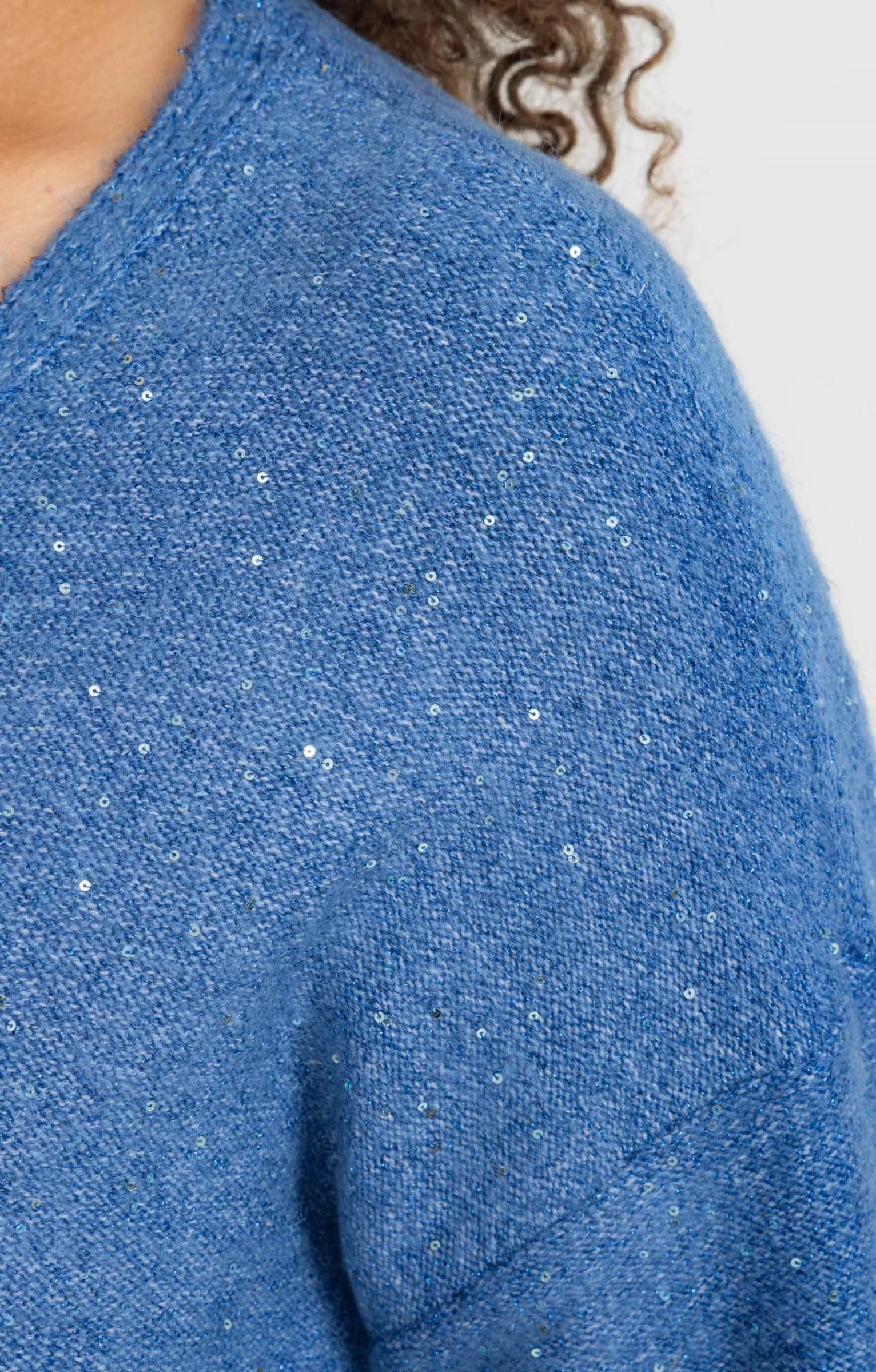 Pull duveteux à manches longues et sequins. Coupe droite subtilement ajustée. Manches longues. Emmanchures tombantes. Col V. Coloris uni. Maille jersey duveteuse. Col, poignets et base en côtes. Sequins en ton sur ton brodés sur l’ensemble de la surface. Papillon métallique appliqué devant de façon latérale à la base.