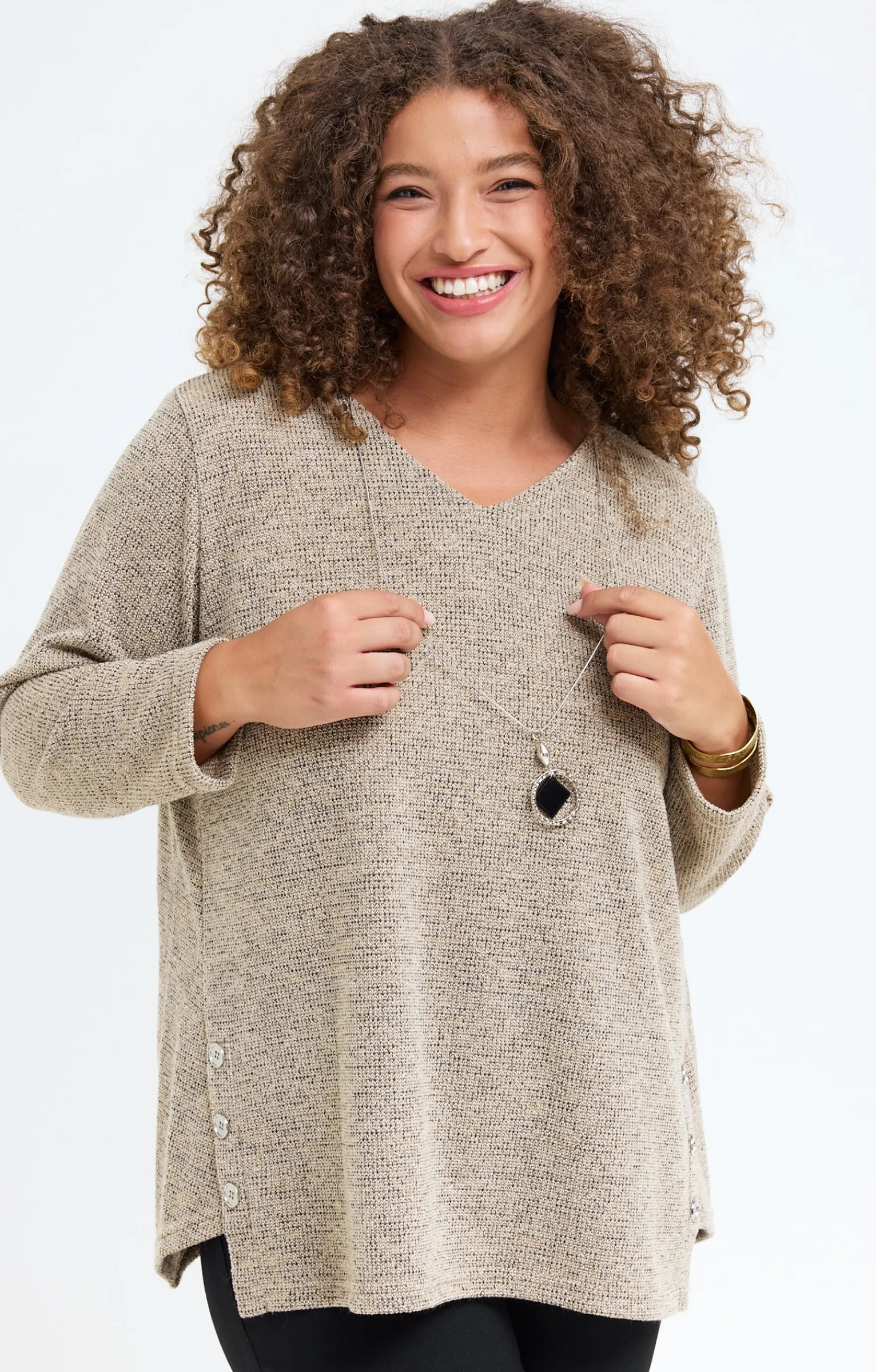 Pull à manches longues avec collier. Coupe fluide. Manches longues. Emmanchures droites. Col V. Coloris chiné. Maille texturée tissée de fils métallisés. Découpes géométriques à la base devant. Boutons en métal à motifs effet quadrillage sur découpes. Collier en maille serpent rond avec pendentif mobile anneau marbré, perle et pastille en métal.