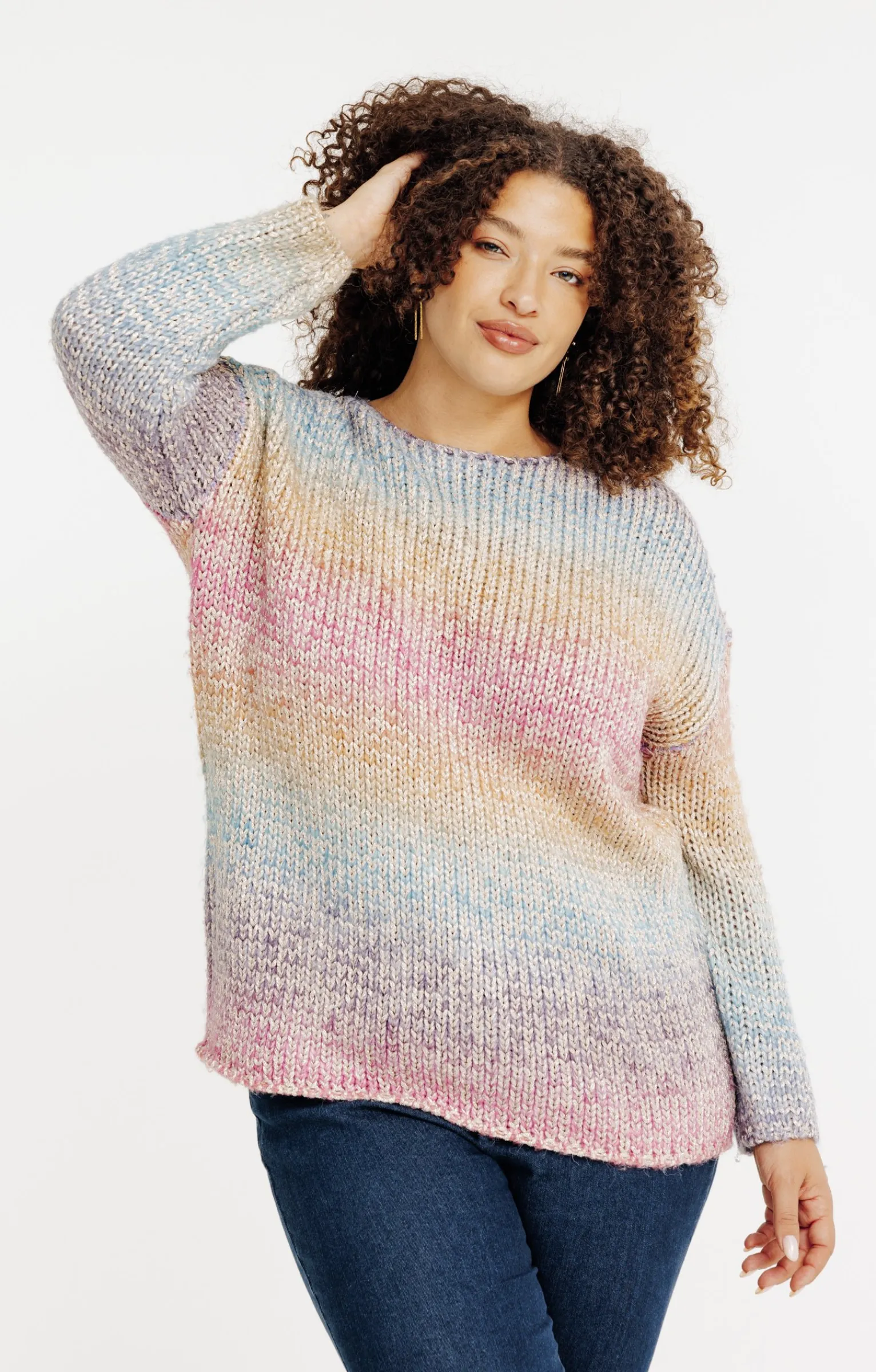 Pull à manches longues en maille chaude irisée multicolore effet arc-en-ciel. Coupe droite. Manches longues montées sur emmanchures tombantes. Col rond ras de cou. Tons multicolores en dégradé horizontal. Maille chaude en côtes anglaises. Finitions droites. Composition contenant de la laine.