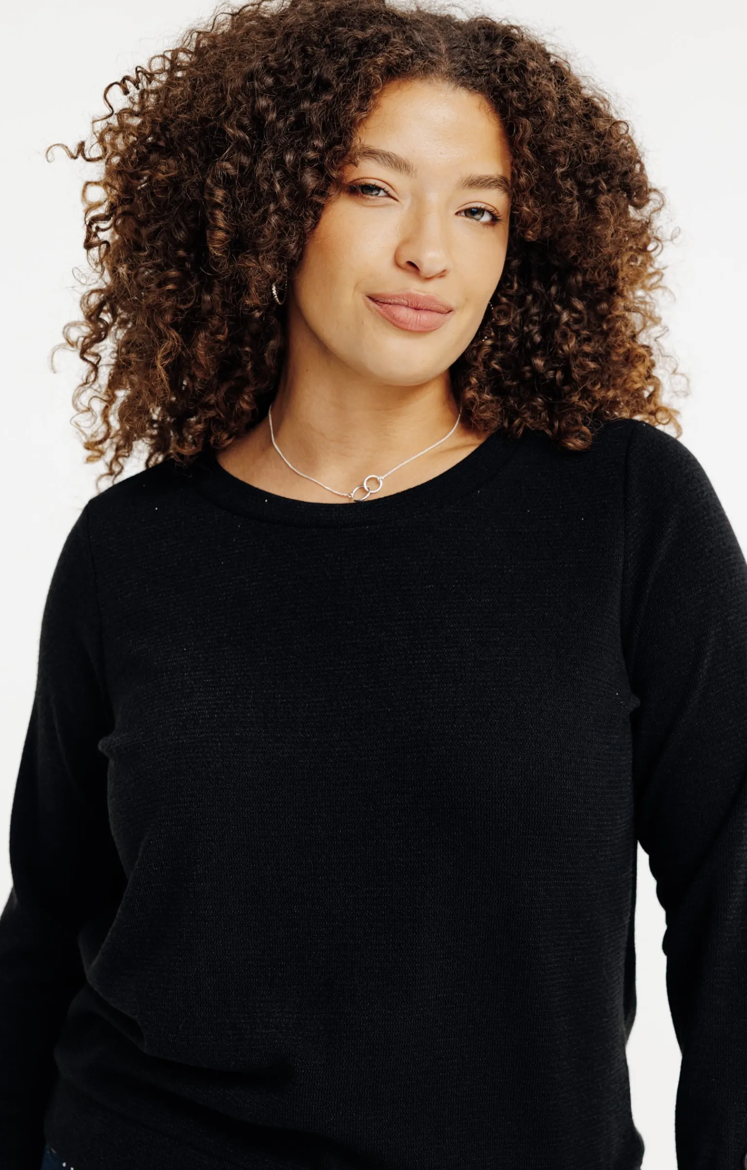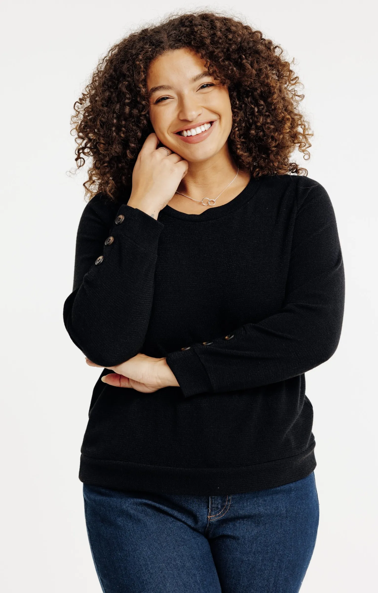 Pull uni à manches longues en maille côtelée et boutons placés. Coupe légèrement ajustée. Manches longues montées sur des emmanchures droites. Col rond. Coloris uni. Maille côtelée extensible. Pattes ornementales avec boutons marbrés aux poignets. Base et poignets en bord-côtes. Base droite.