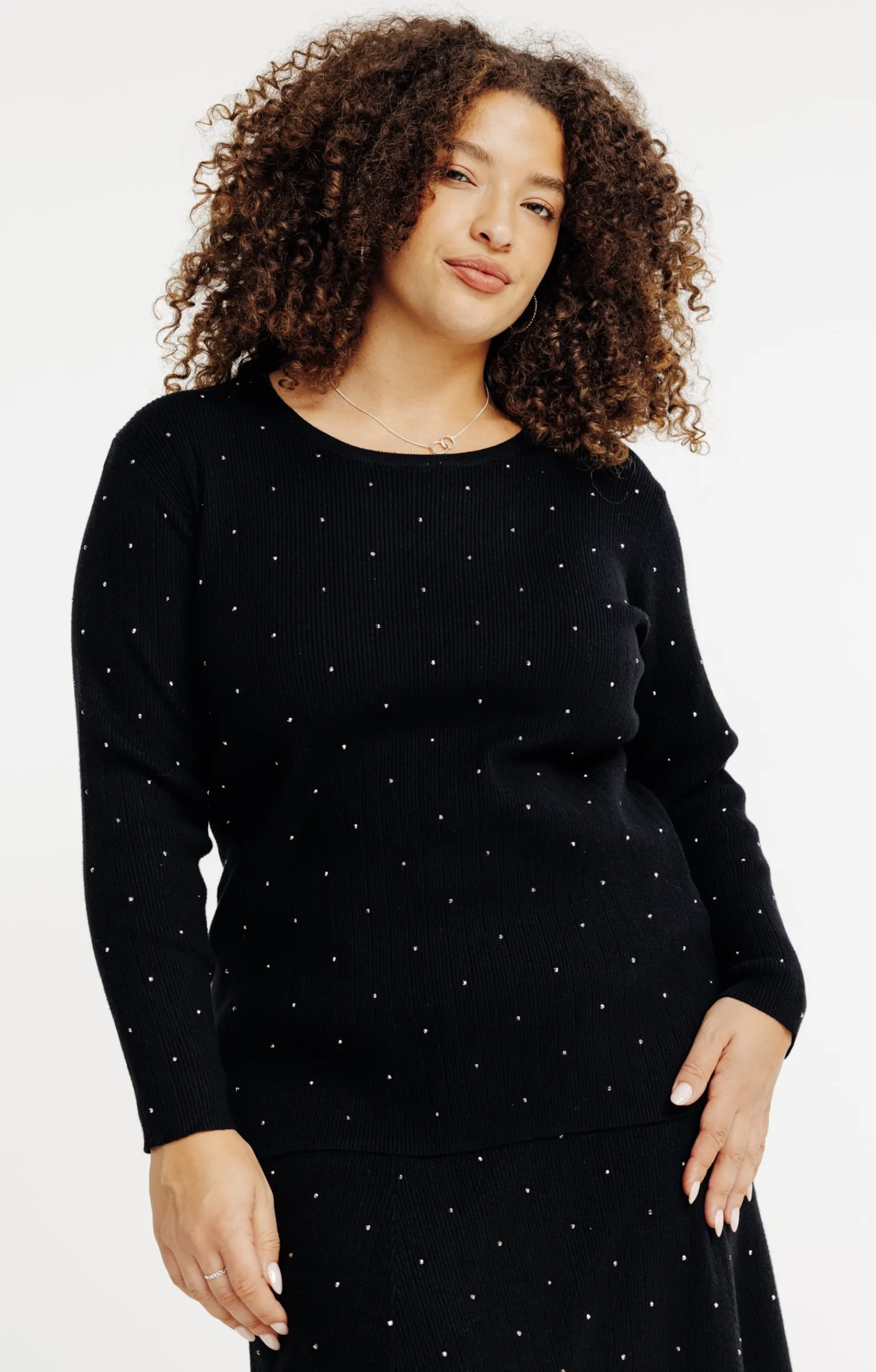 Pull uni côtelé à manches longues et strass. Coupe subtilement ajustée. Manches longues montées sur des emmanchures droites. Col rond. Teinte unie. Maille fine tricotée en côtes larges 4×1. Col, poignets et base en bord-côtes. Application de strass contrastés devant et sur les manches. Base droite.