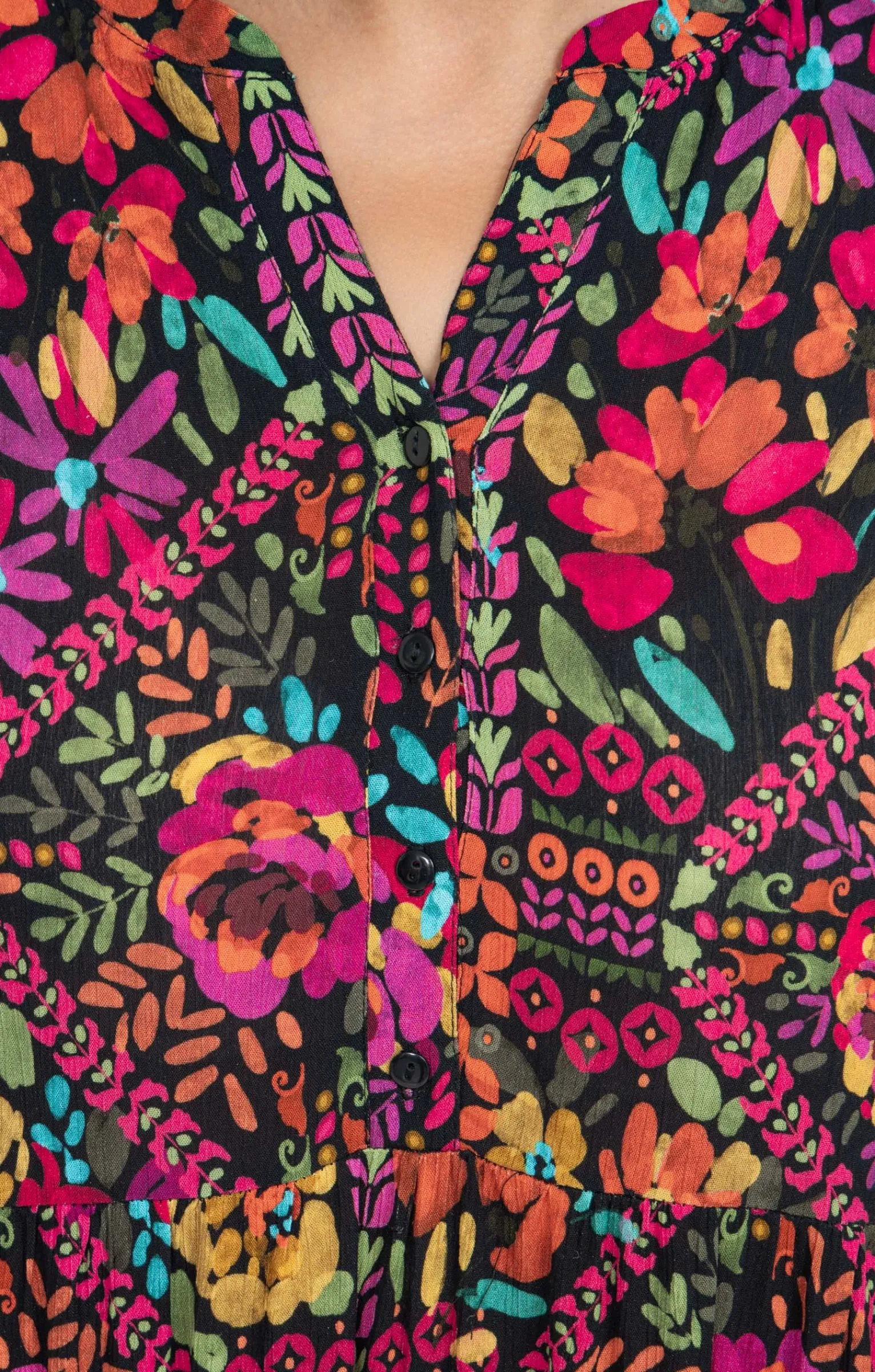Robe longue à manches longues avec imprimé multicolore. Coupe fluide longue. Manches longues. Emmanchures droites. Col rond avec découpe V. Fermeture boutonnée sous le col. Motifs floraux multicolores imprimés. Matière fluide. Taille empire. Découpe effet plastron devant. Fronces sous la taille. Finition volant froncé à la base. Manches retroussables à l’aide d’une patte de boutonnage.