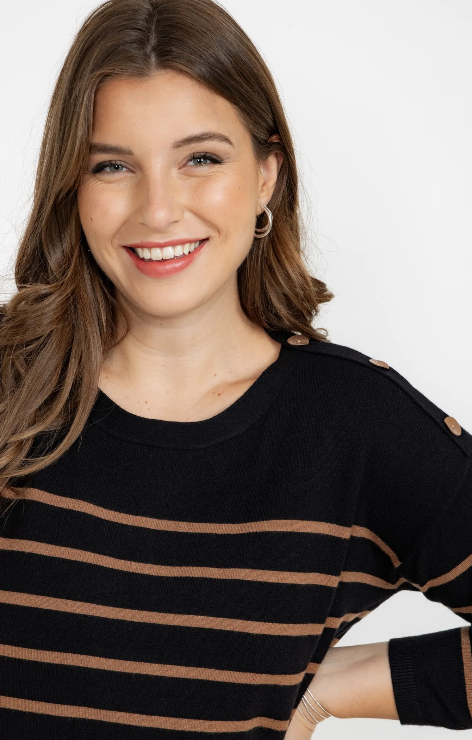 Robe pull inspiration marinière avec boutons aux épaules. Coupe droite courte. Manches 3/4. Emmanchures tombantes. Col rond. Rayures bicolores horizontales tricotées. Maille jersey. Poignets et base en côtes. Boutons fantaisie incurvés appliqués sur pattes épaules. Base fendue sur les côtés.