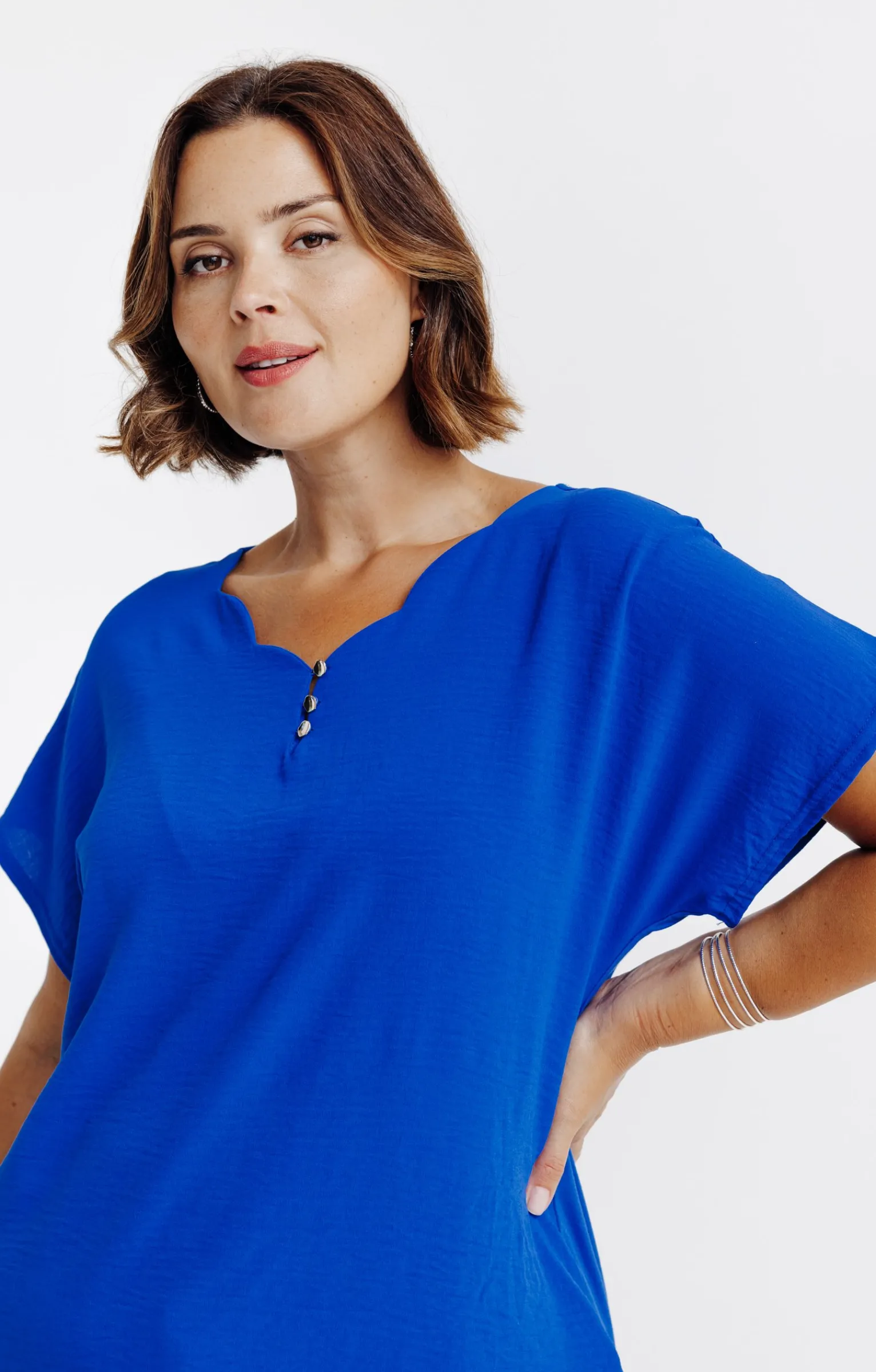 T-shirt uni à manches courtes et col festonné. Coupe droite. Col fendu avec trois petits boutons décoratifs. Tissu à texture discrètement striée. Longueur standard.