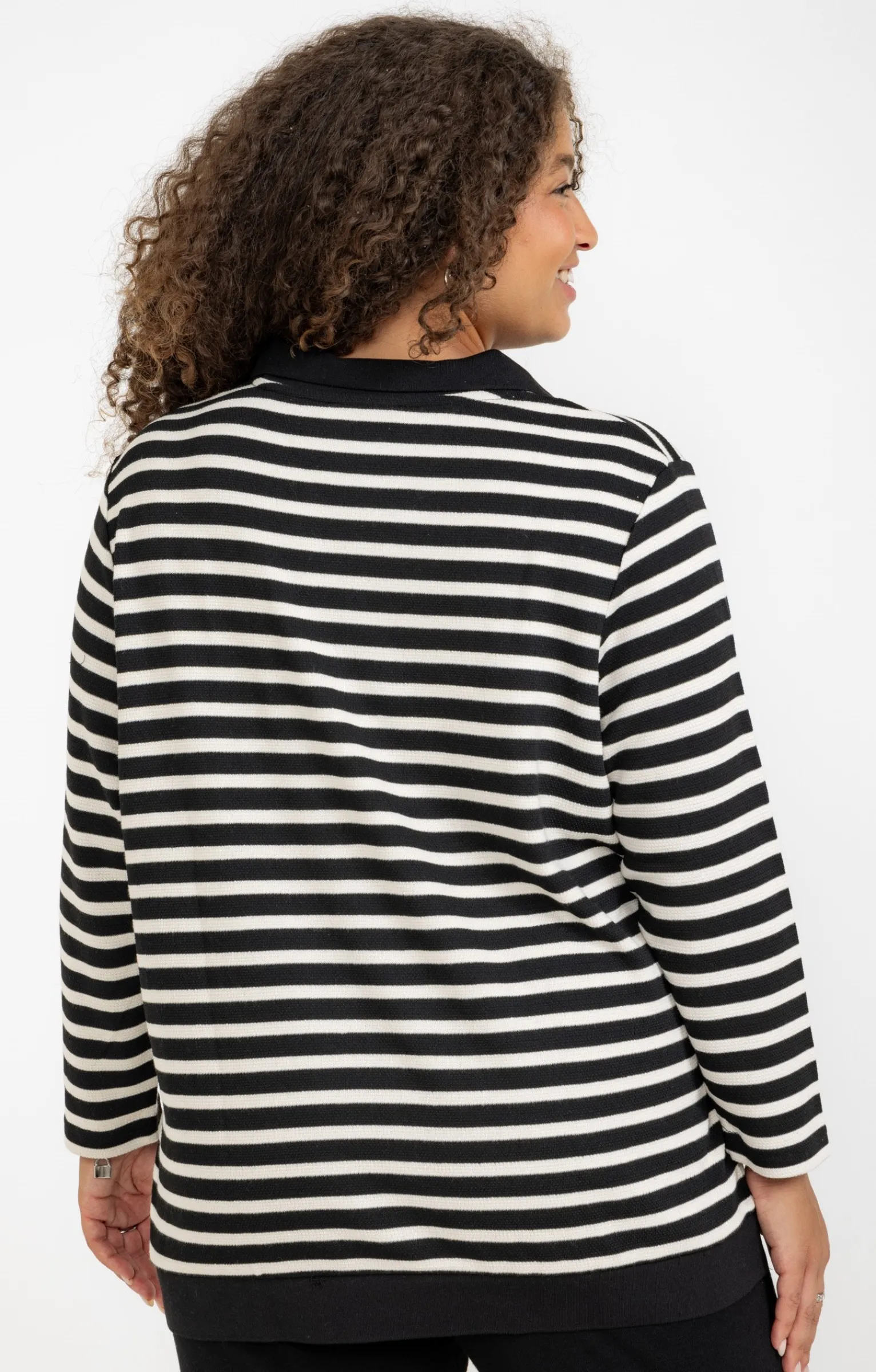 T-shirt à manches longues esprit polo rayé. Coupe droite. Manches longues. Emmanchures droites. Col classique avec ouverture V croisée. Motif à rayures horizontales bicolores. Maille fantaisie devant, dos et manches. Col et base en maille jersey unie en teinte assortie. Finition droite de la base.