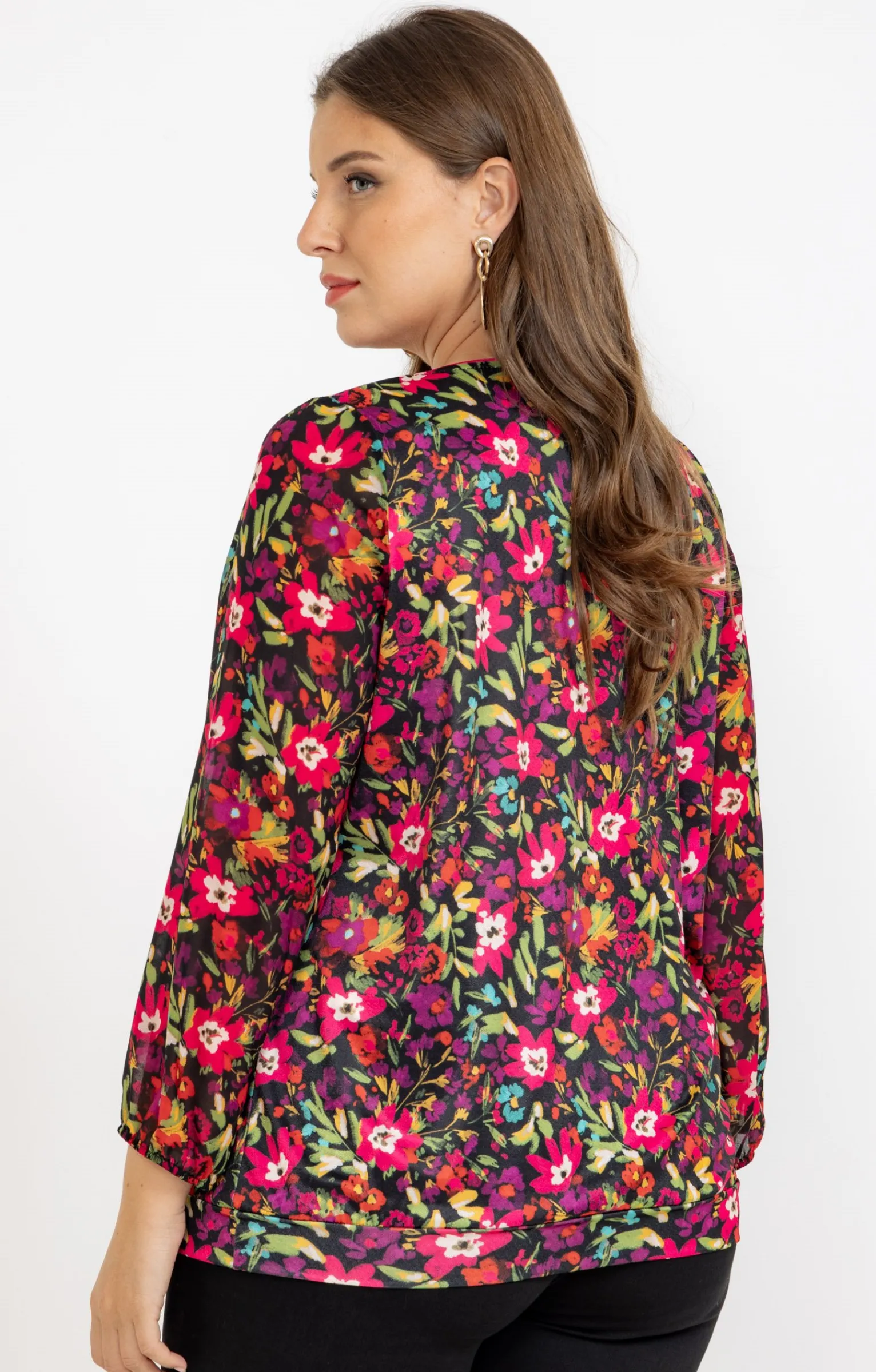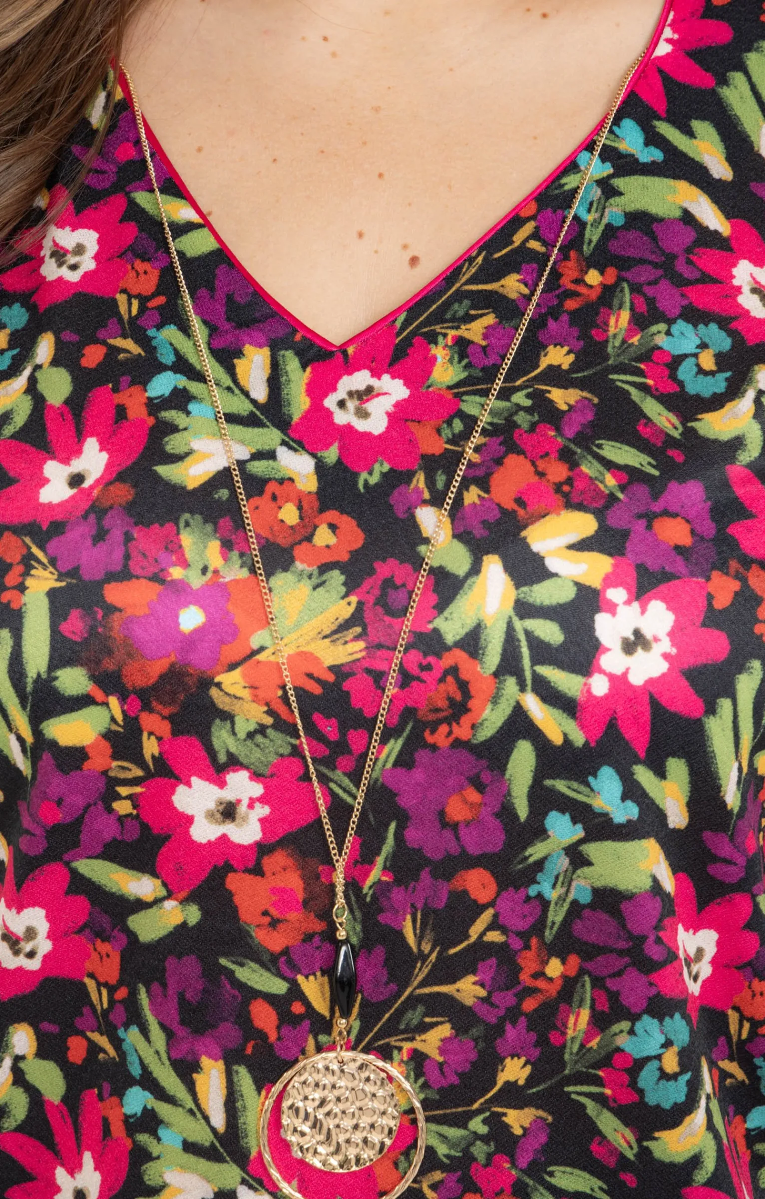 T-shirt imprimé floral à manches longues et col V avec collier. Coupe droite. Manches longues avec poignets élastiqués. Col V avec bordure passepoilée et collier en chaîne dorée. Pendentif anneau et médaillon avec détails perle facettée. Imprimé floral sur toute la surface du modèle. Motif effet aquarellé. Tissu façon crêpe extensible. Base droite légèrement resserrée avec large bande de finition.
