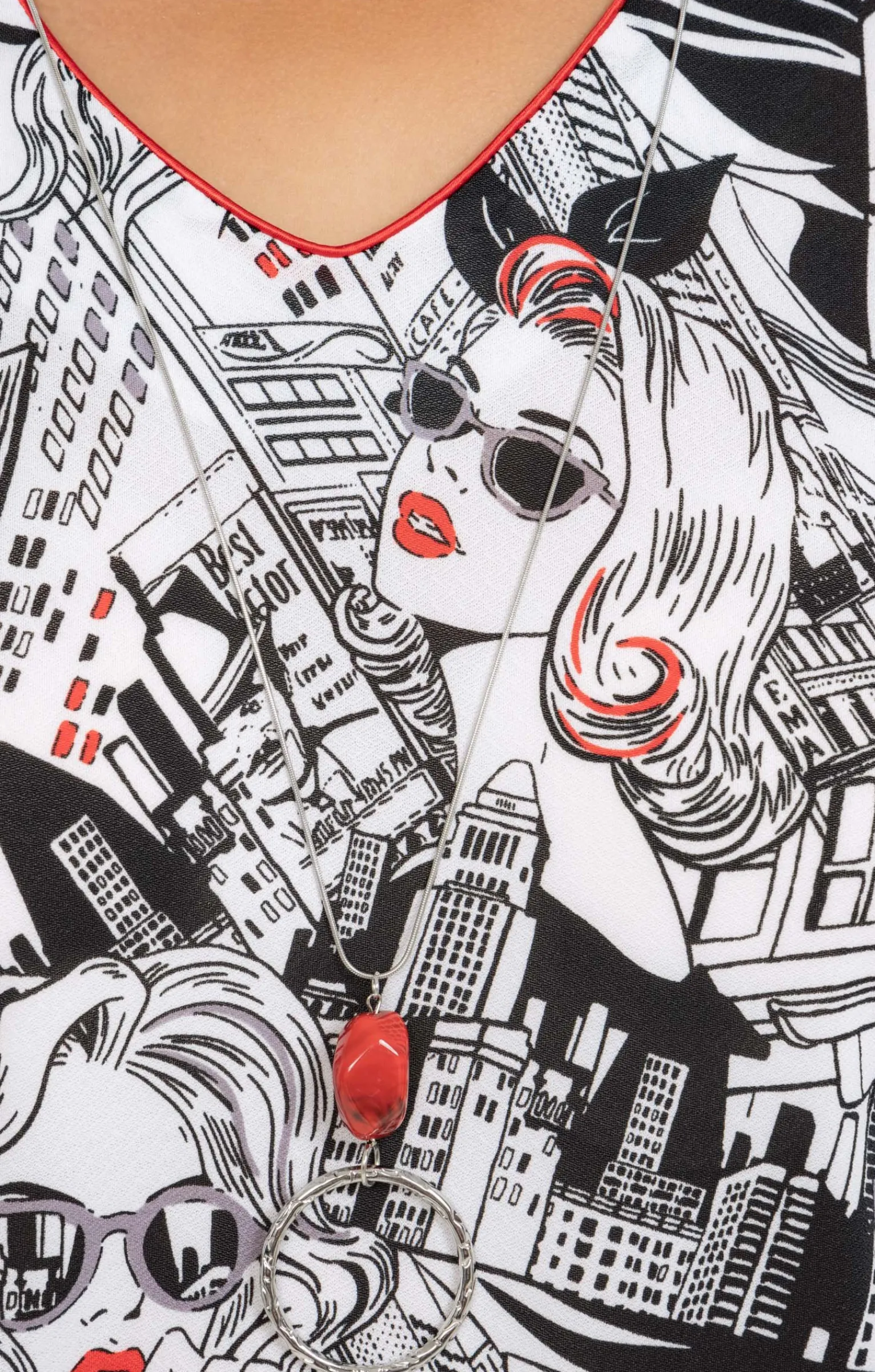 T-shirt bimatière imprimé inspiration pop art avec collier. Coupe blousante. Manches longues bouffantes. Décolleté V. Imprimé multicolore femmes et ville entremêlées. Devant et dos en maille extensible. Manches en voile non doublé. Base resserrée. Liseré contrasté en finition du col. Collier formé d’une chaîne et d’un pendentif anneau martelé et perle effet pierre polie.