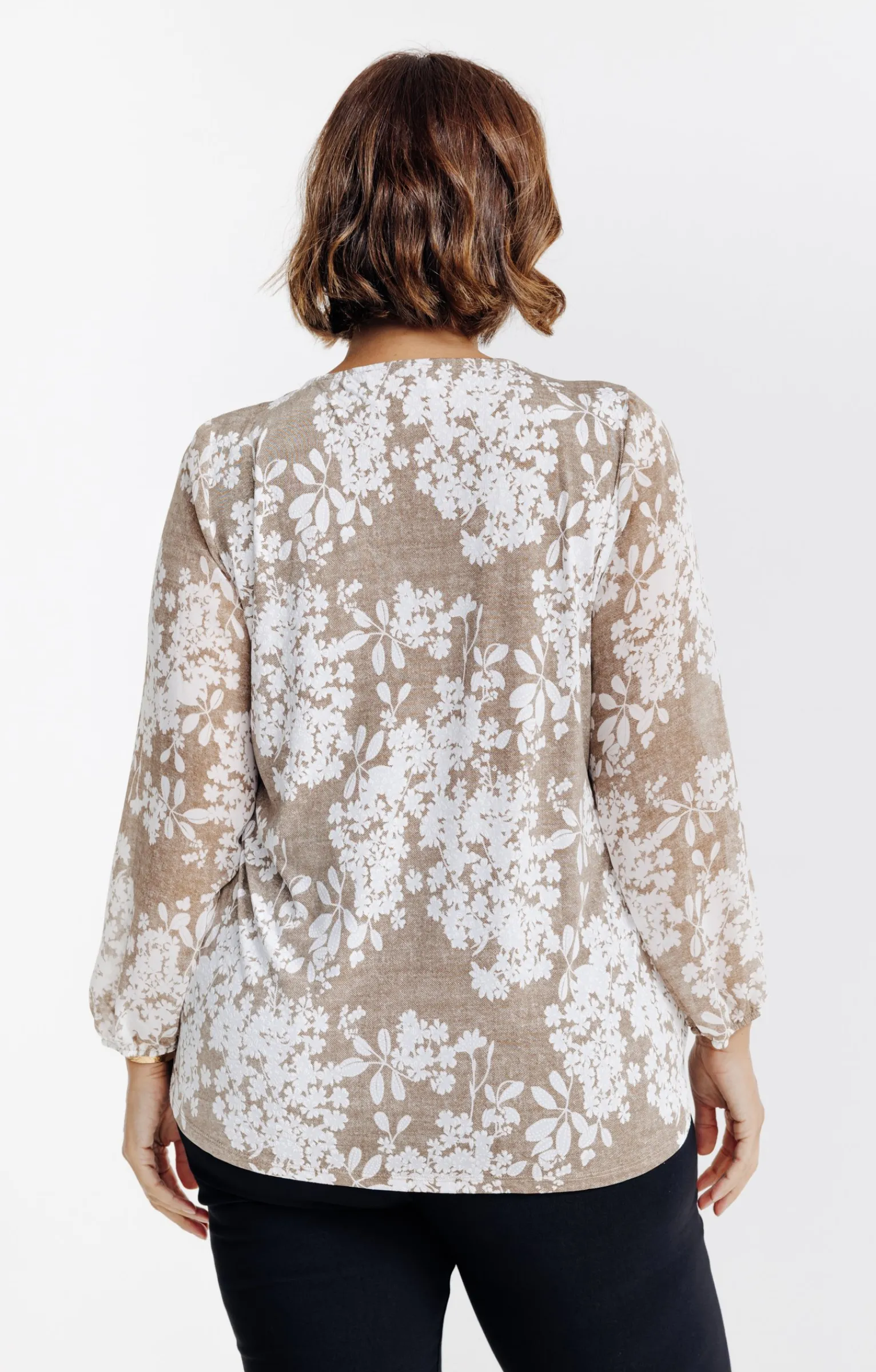 T-shirt imprimé à manches longues. Coupe droite. Col rond fendu avec 3 petits boutons. Fronces sous l’encolure devant. Imprimé floral en all-over. Base arrondie.