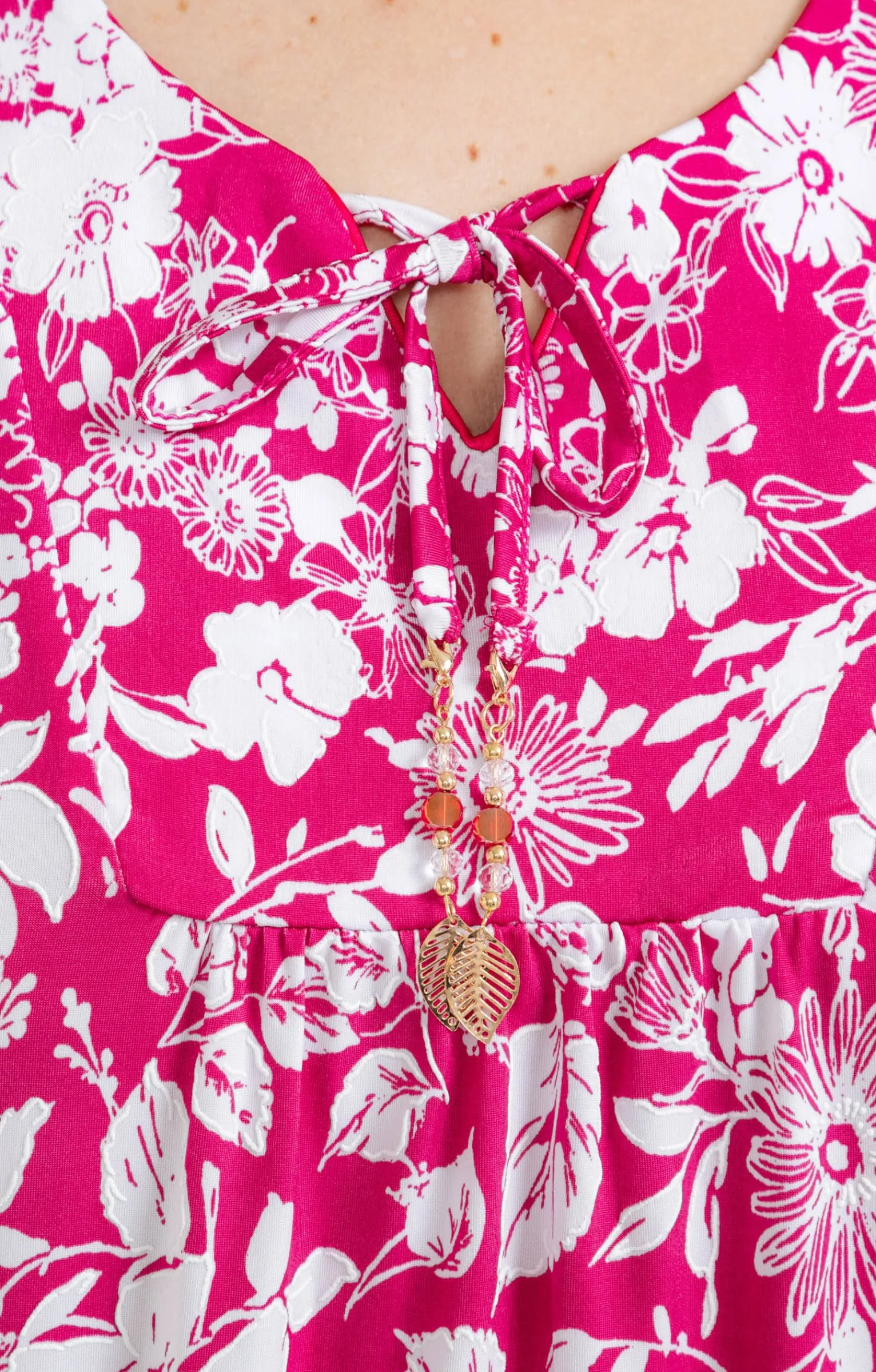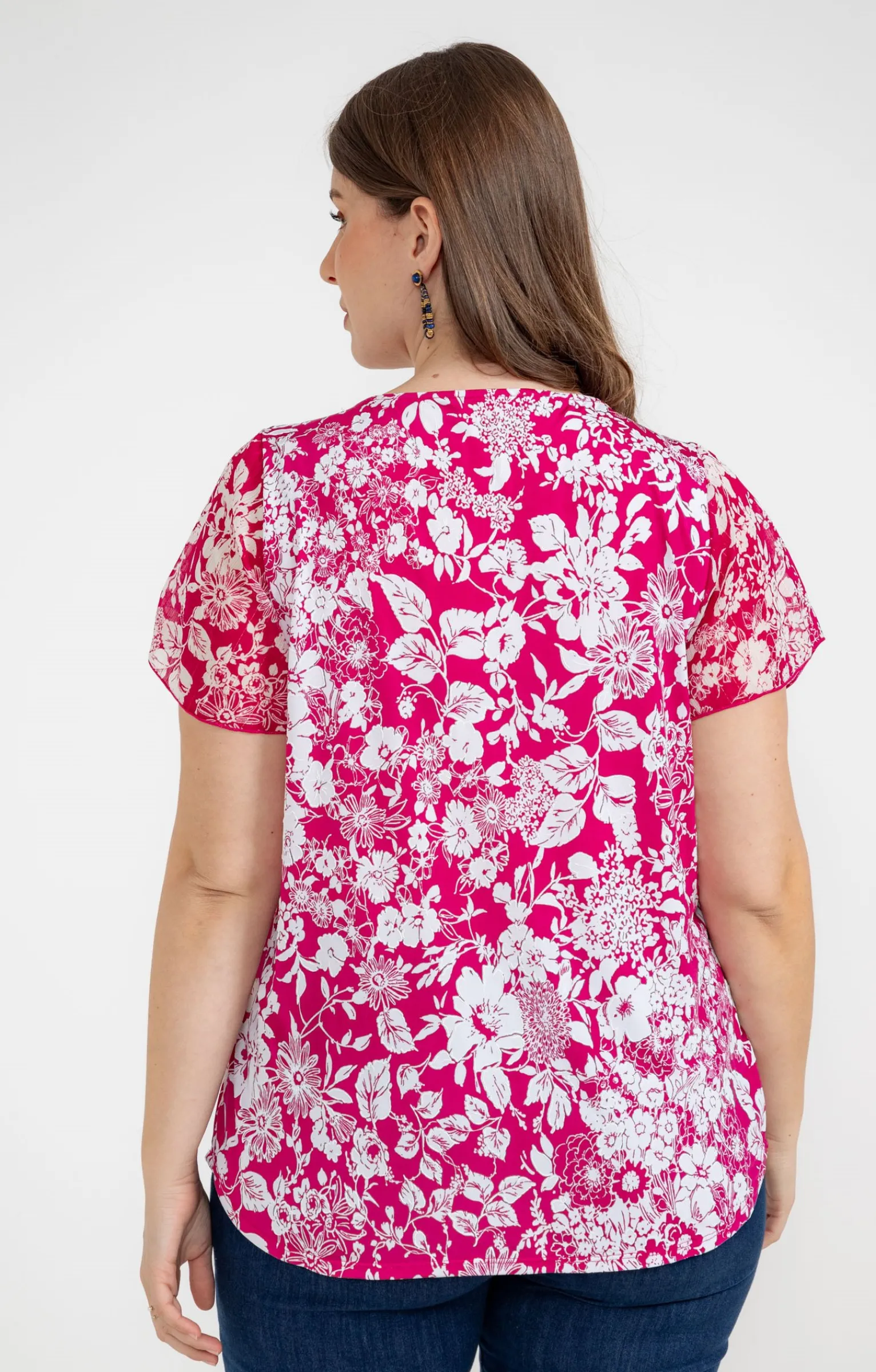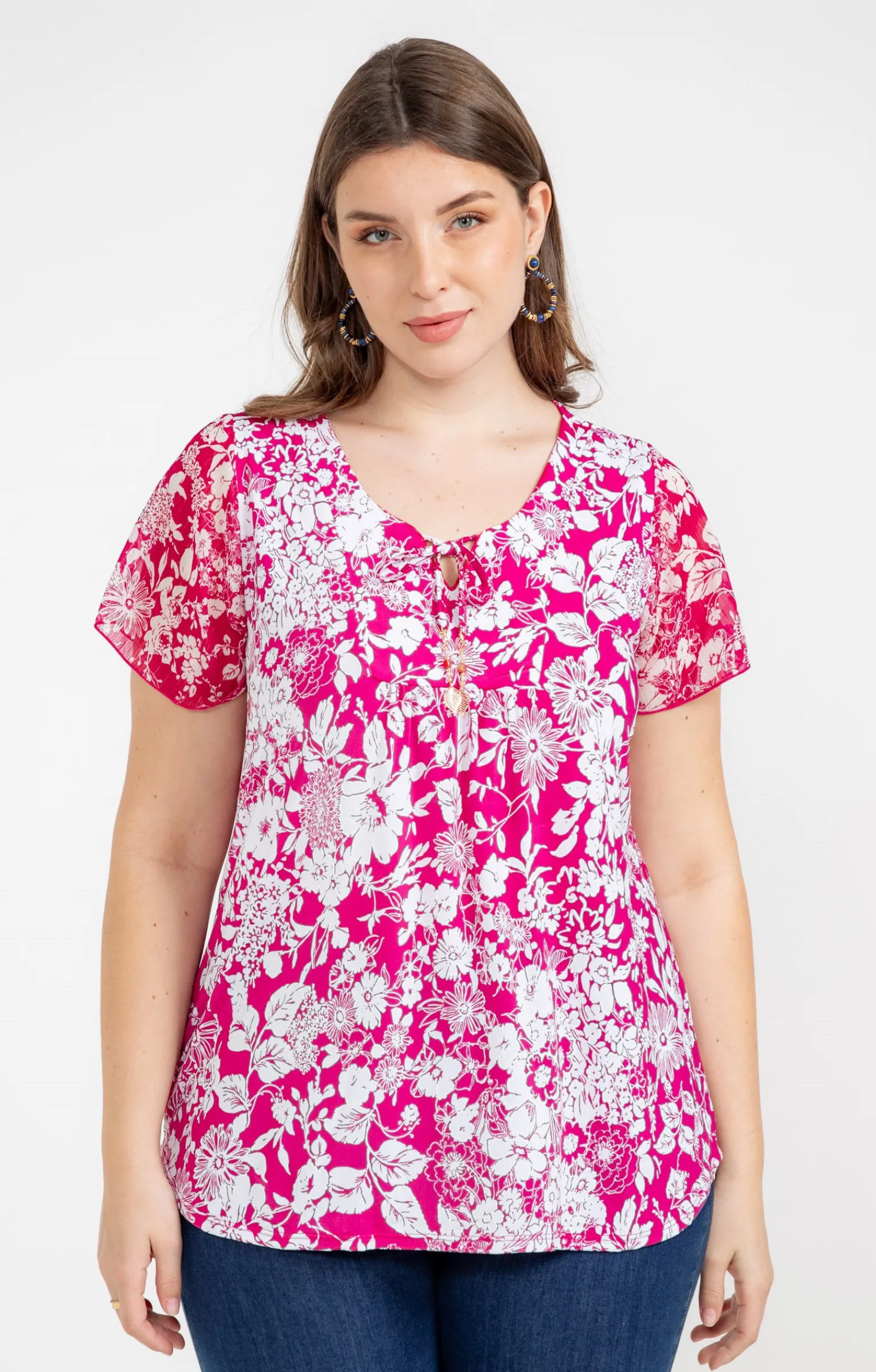 T-shirt floral bimatière à col rond et manches courtes détail lien. Coupe droite mi-longue. Manches courtes godets semi-transparentes finition bourdon contrastant. Col rond fendu avec liens à perles et pampilles amovibles. Imprimé floral bicolore sur l’ensemble. Corps extensible, manches en crêpe semi-transparent rehaussé de fils métalliques. Double surpiqûre à la base.