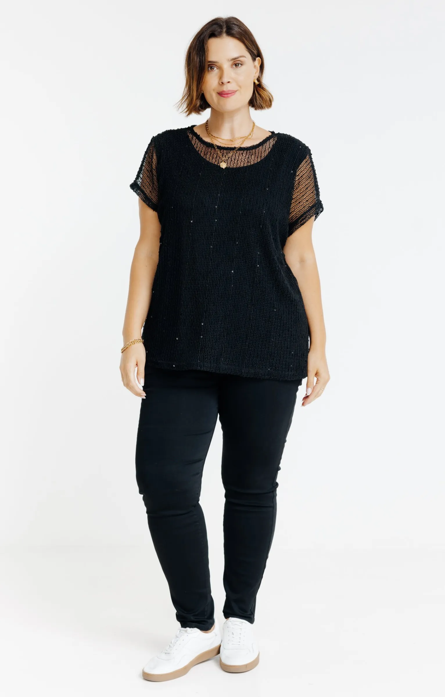 T-shirt à manches courtes en maille ajourée. Coupe droite. Col rond. Finition bord à bord. Tissu uni orné de strass discrets répartis sur l’ensemble du modèle. Effet de transparence sur les manches et le haut du buste. Notre mannequin Rafa mesure 1m75 et porte un t-shirt taille 1.