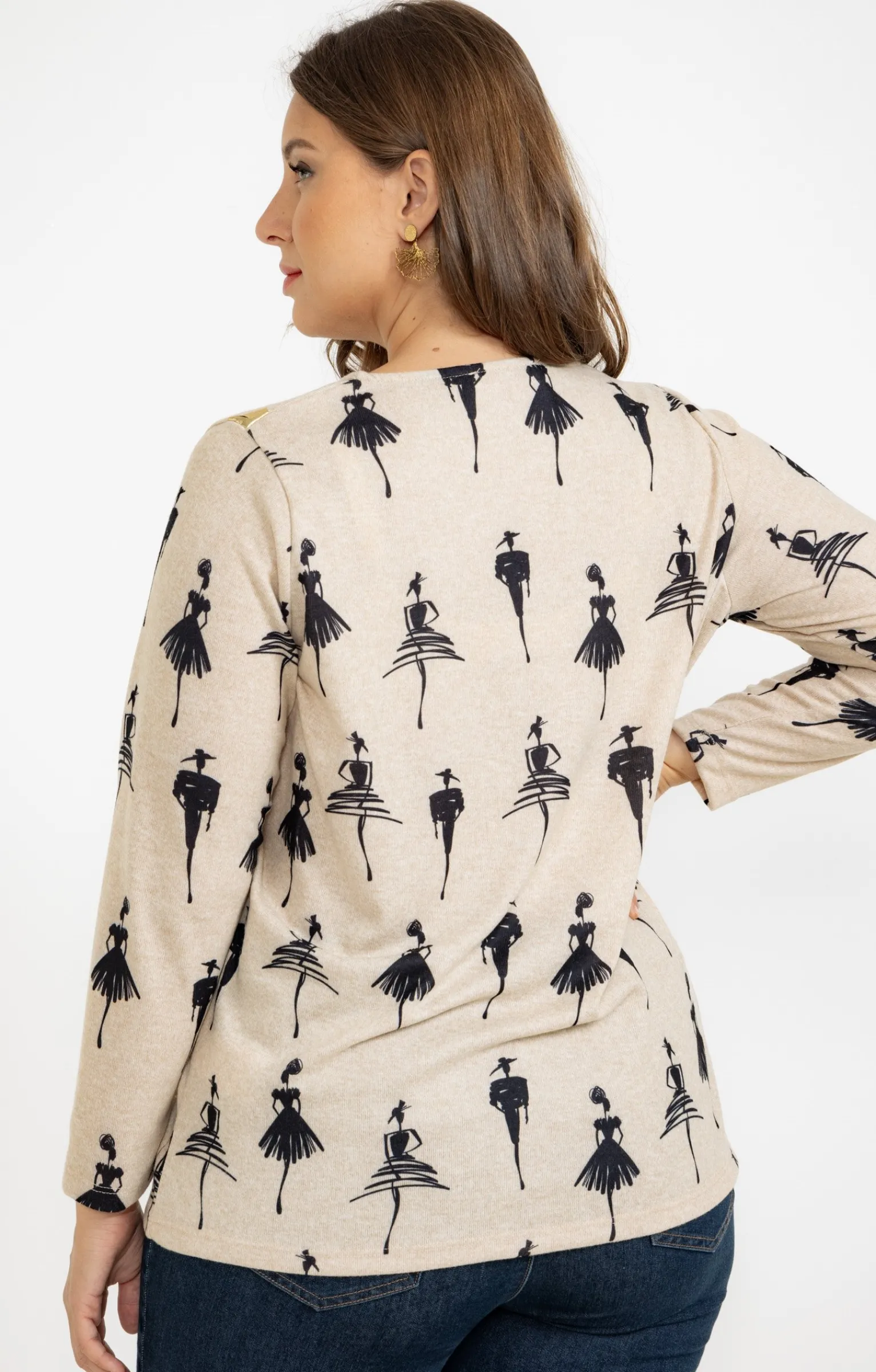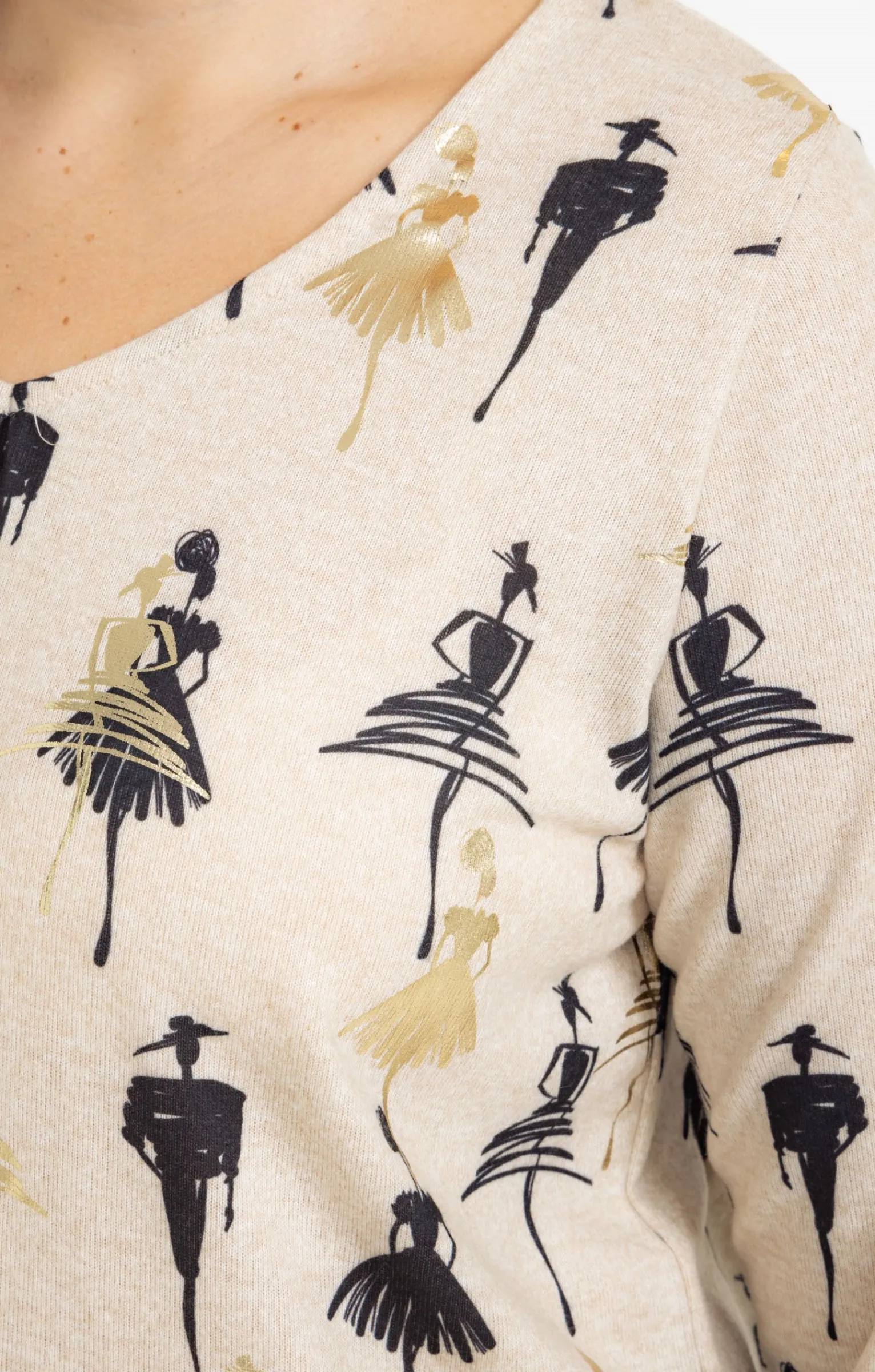 T-shirt à manches longues et col V en maille chaude imprimé silhouettes femmes. Coupe droite. Manches longues. Col V. Imprimé silhouettes femmes. Détails motifs dorés avec effet de surimpression devant. Tissu en maille chaude effet chiné. Matière extensible. Fines surpiqûres ton sur ton en finition du modèle. Base droite. Composition contenant du polyester recyclé.