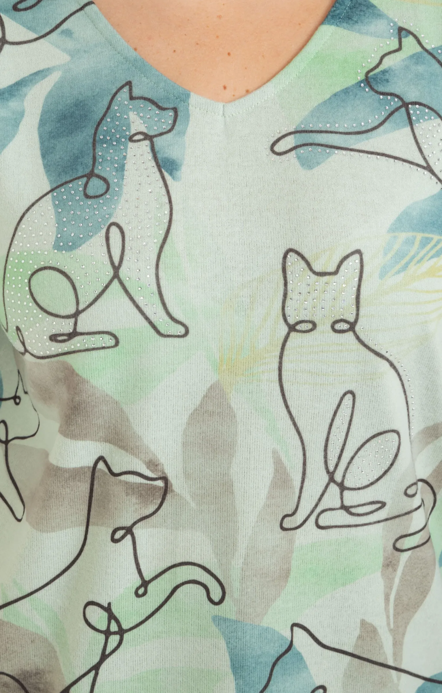 T-shirt en maille chaude imprimé chats avec détails strass à manches longues et col V. Coupe droite. Manches longues. Col V. Imprimé chats. Motifs façon dessin de contour sur fond abstrait effet aquarelle. Détails strass devant. Tissu en maille chaude. Matière extensible. Fines surpiqûres discrètes en finition du modèle. Base droite. Composition contenant du polyester recyclé.
