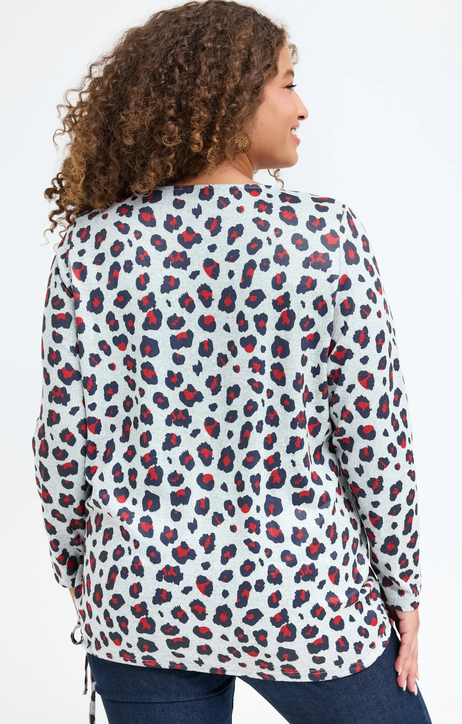 T-shirt à nouer imprimé léopard à manches longues et col rond. Coupe droite avec base réglable. Manches longues. Col rond. Imprimé léopard sur toute la surface du modèle. Tissu en maille aspect chiné extensible. Base ajustable avec liens coulissants à nouer sur le côté. Fines surpiqûres discrètes en finition.