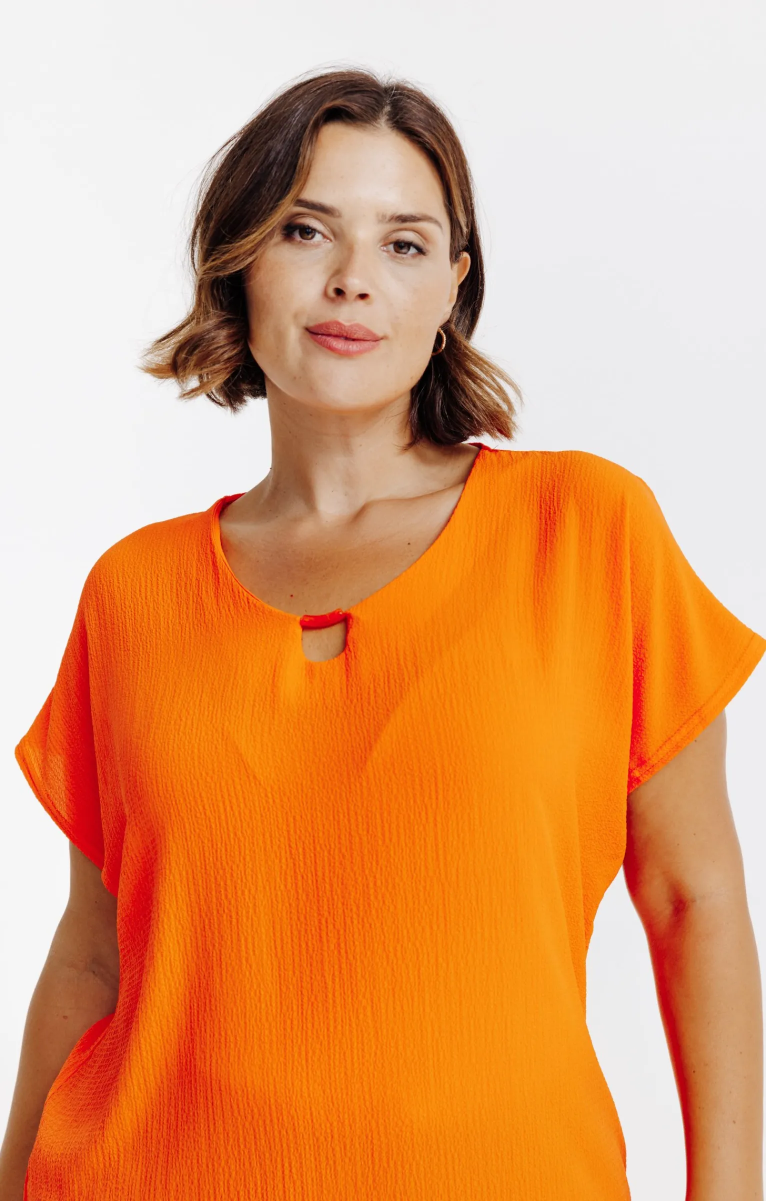 T-shirt uni à manches courtes et col rond avec détail décoratif. Coupe droite. Manches courtes à emmanchures tombantes. Base arrondie. Tissu à effet froissé.