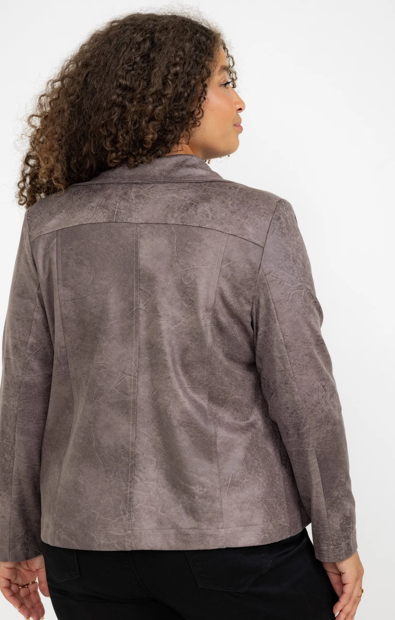 Veste suédée unie zippée à manches longues et col tailleur. Coupe droite avec découpes bretelles devant et au dos. Longueur courte. Manches longues. Col tailleur. Fermeture zippée. 2 poches à zip à la taille. Coloris uni. Tissu à texture suédée extensible. Empiècement de confort et pli surpiqué vertical au dos. Studs sur les pointes des revers du col. Surpiqûres ton sur ton en finition. Base droite.